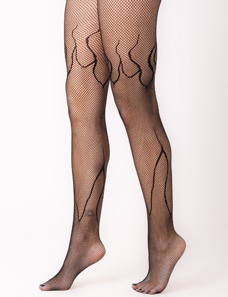 High waisted and with a flame on the legs, these small mesh fishnets are perfect to slip on with your fit.