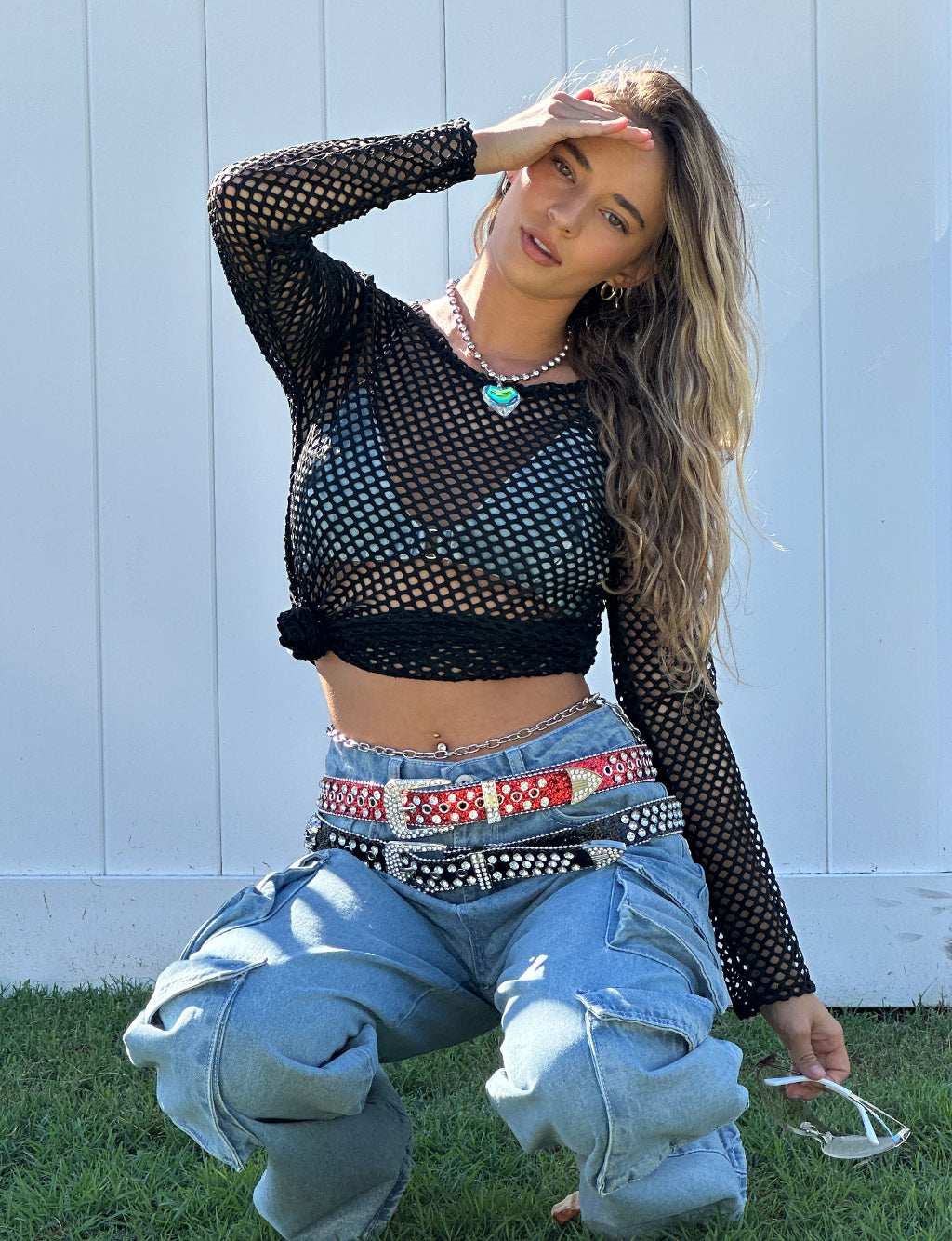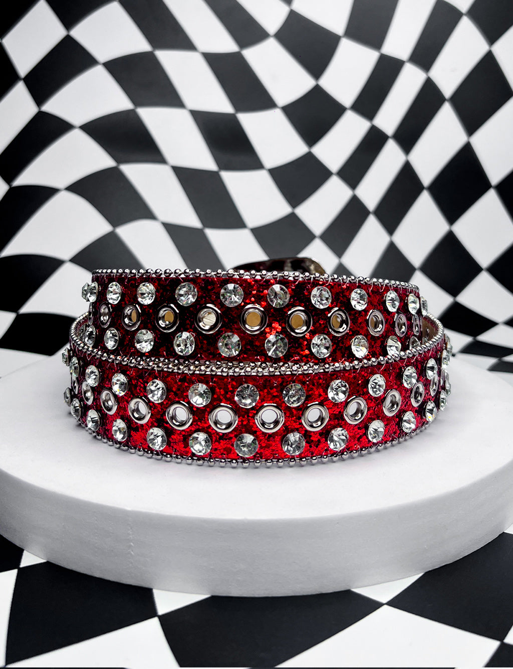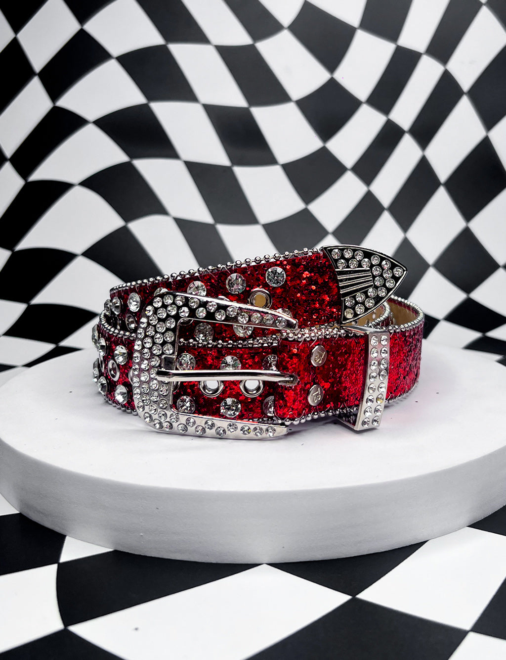 Yee Haw! This rhinestone studded red belt of your dreams will embellish any fit flawlessly. With silver ball chain accents, and belt holes covering the whole belt, you can adjust this to whatever circumference needed.