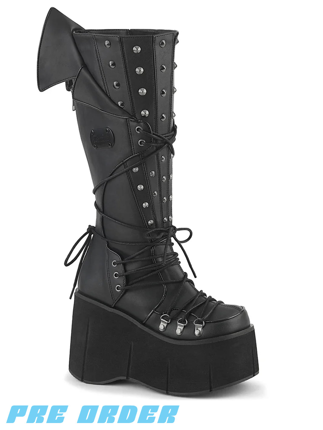 These knee-high platform boots bring pure attitude — loaded with spikes, D-rings, and serious stomp appeal.