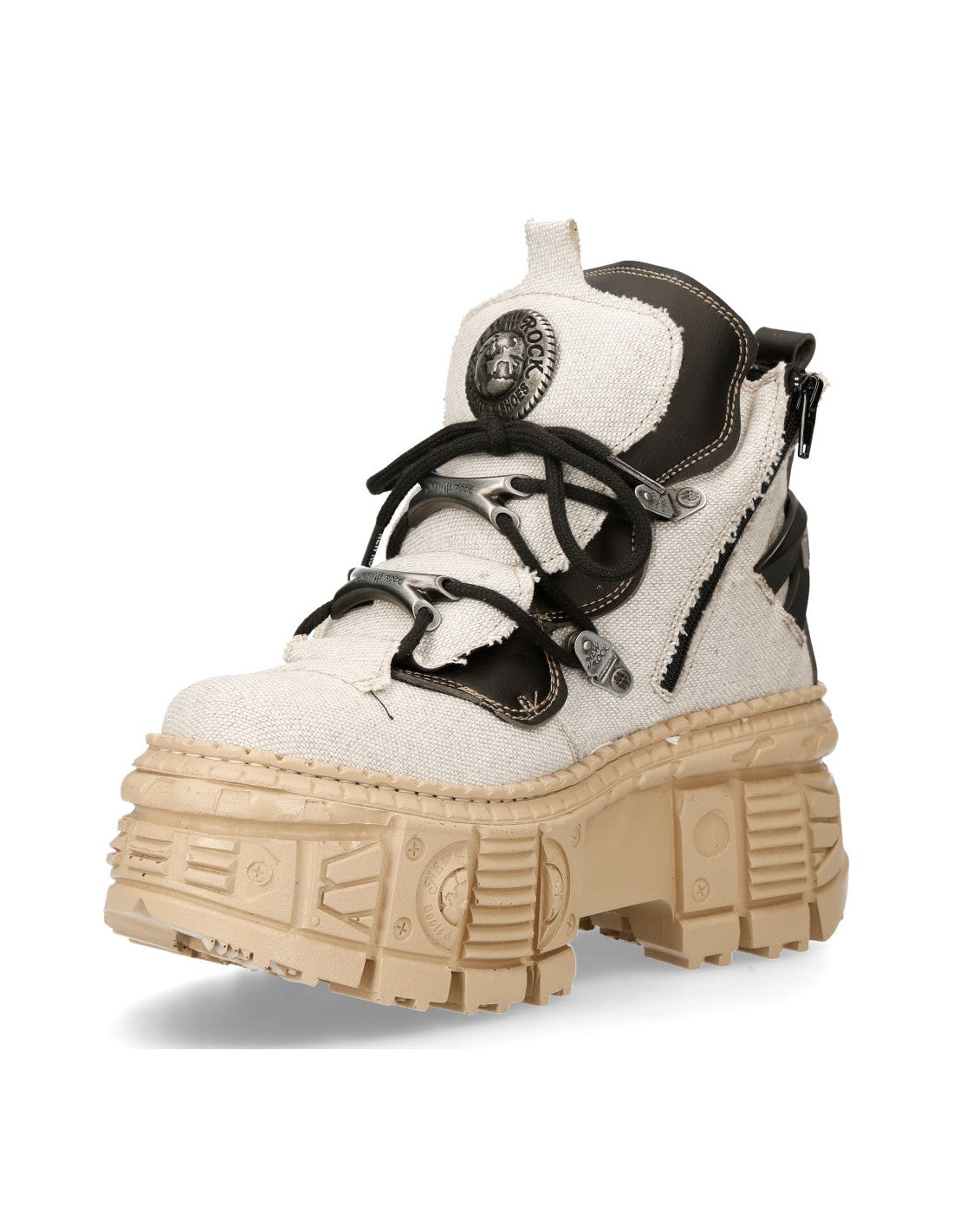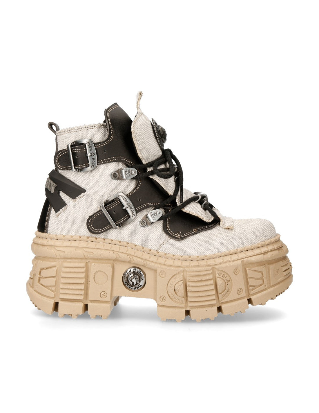 New Rock - The ultimate goth footwear brand from Spain! From the Wall collection comes the M-WALL052-V3, a statement ankle boot made from high quality vegan & recycled materials. Beige and black tones with layered hardware give it a strong, structured look with that unmistakable New Rock shape.