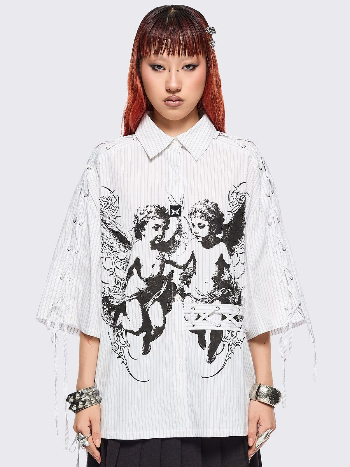 Heaven’s favourite grandpa. This striped shirt comes with angel energy – black graphic on the front, lace-up detailing, and an oversized fit made for effortless vibes.