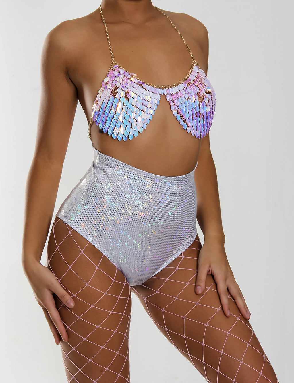Made from shimmering light pink sequins, this magical chain-bra is perfect to channel your inner mermaid and dazzle the day away at your next disco.