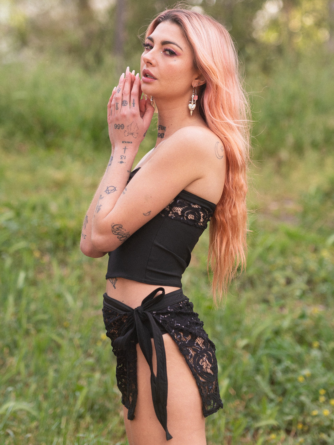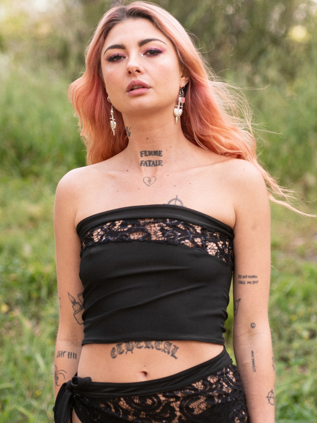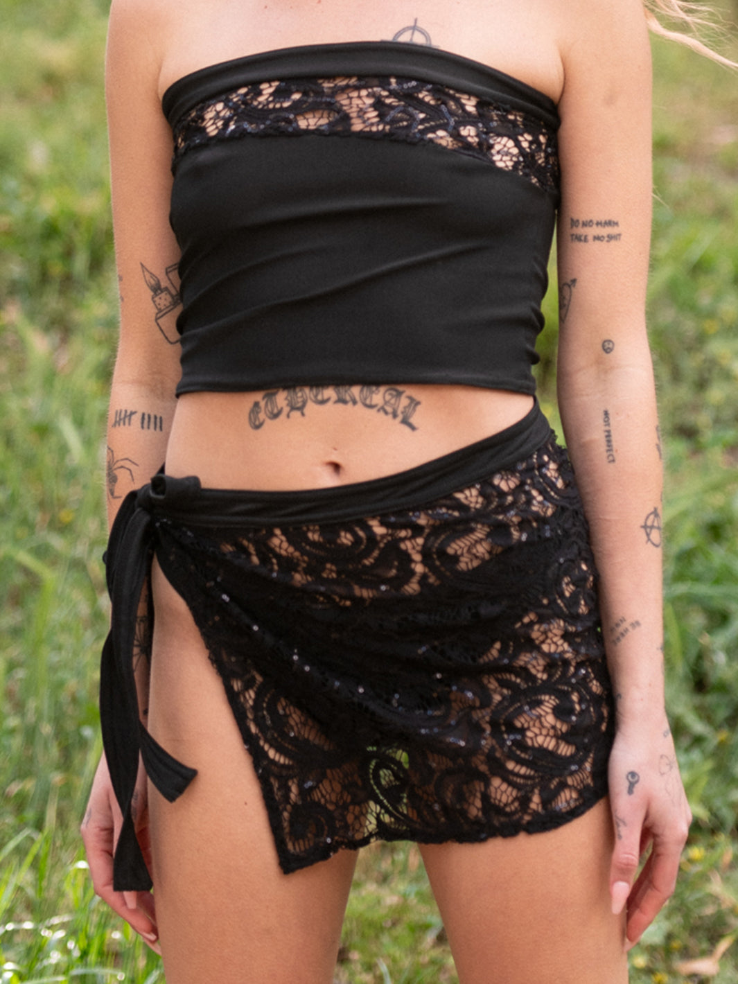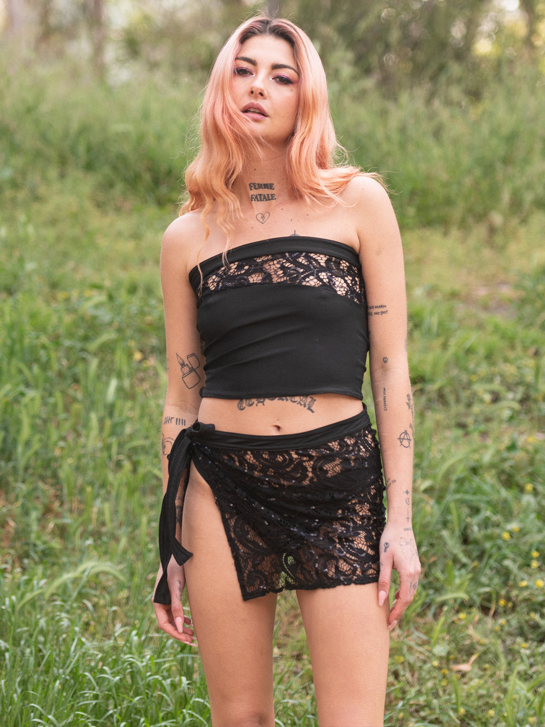 Meet the Azelea Top - the chicest & hottest lil crop from Melbourne brand Soulan Zee. This bandeau style top features a gorgeous sequin black lace panel that can be worn at the top or bottom and is simply divine.