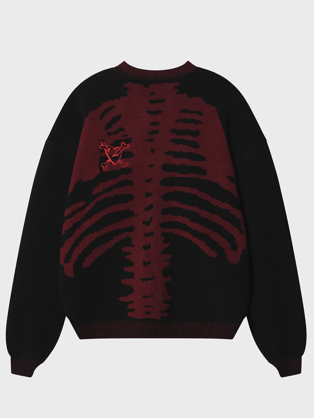The Backbone Knit is your next statement piece - super soft, heavyweight, and guaranteed to be stolen by your mates. Featuring an embroidered heart and bones emblem on the front, and a bold woven backbone design on the back.