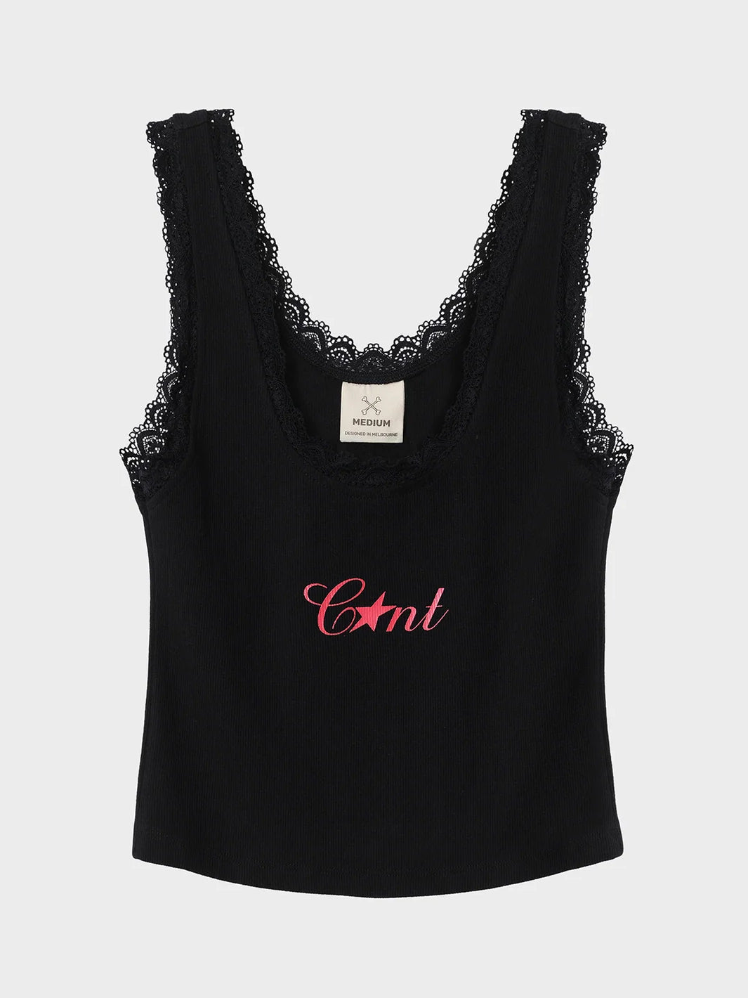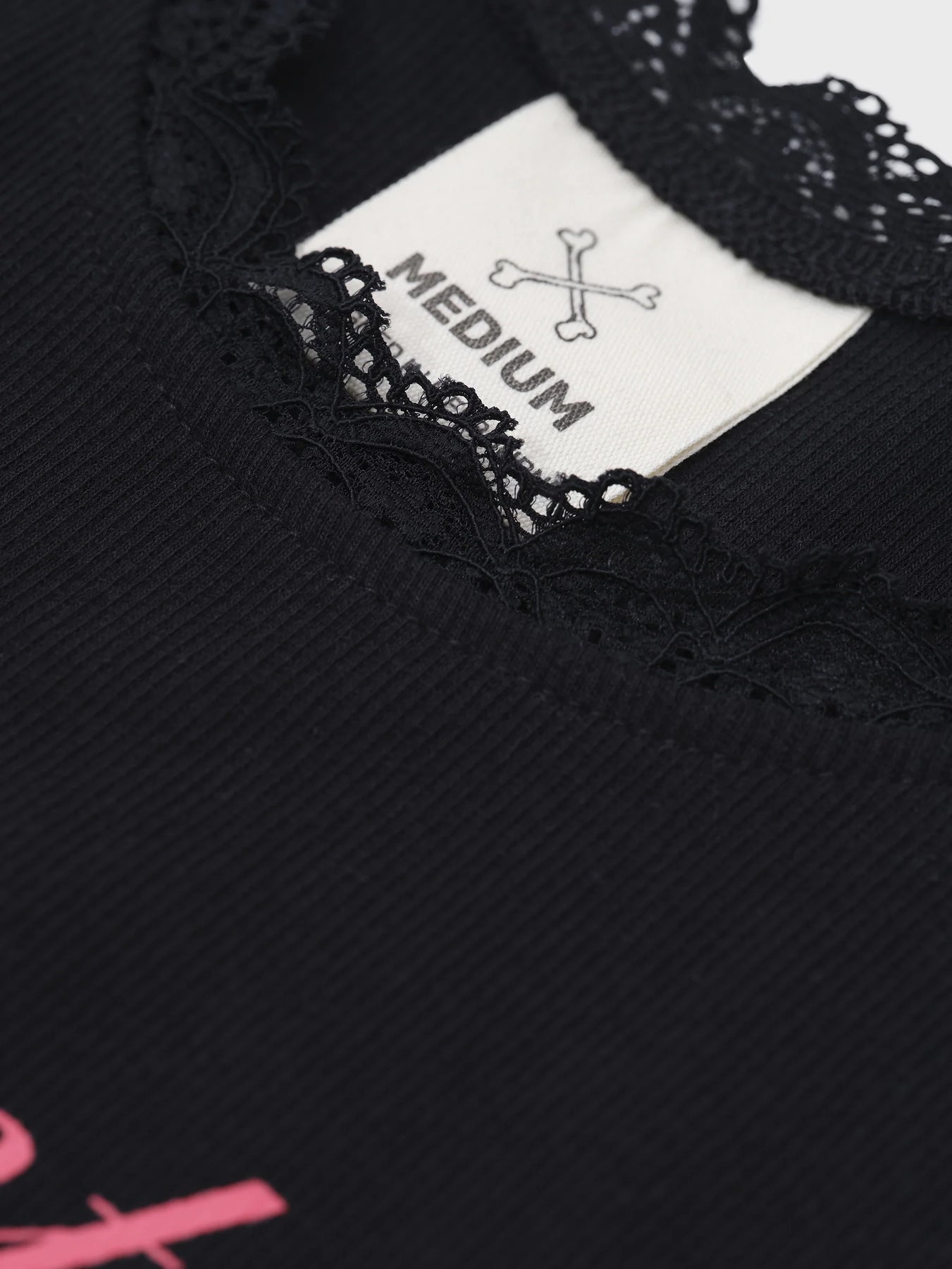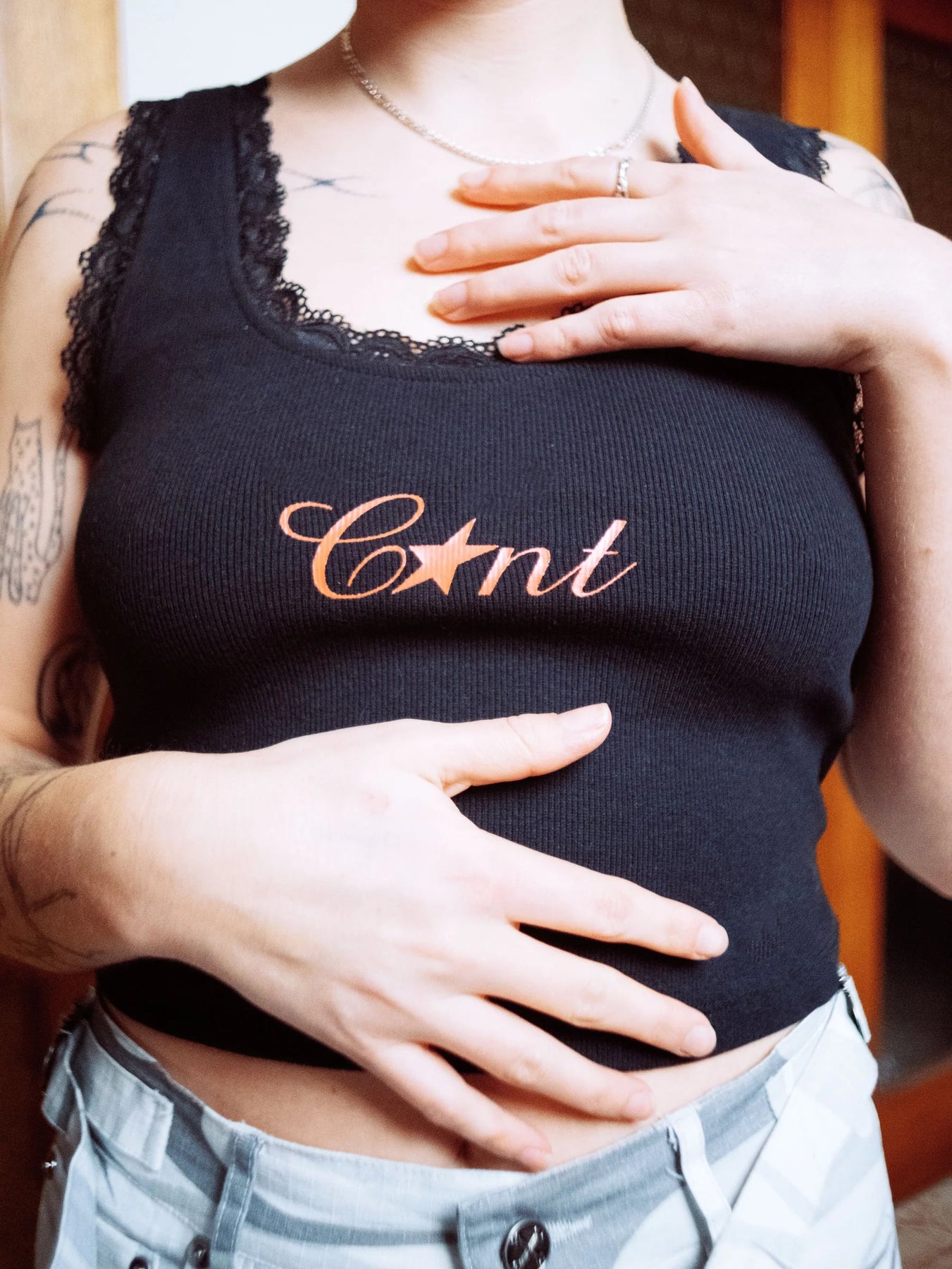 Drop the C bomb - Billy Bones' best-selling lace crop is back and bolder than ever. Made from super comfy stretch fabric with red embroidery front and centre, finished with ruffled hems.