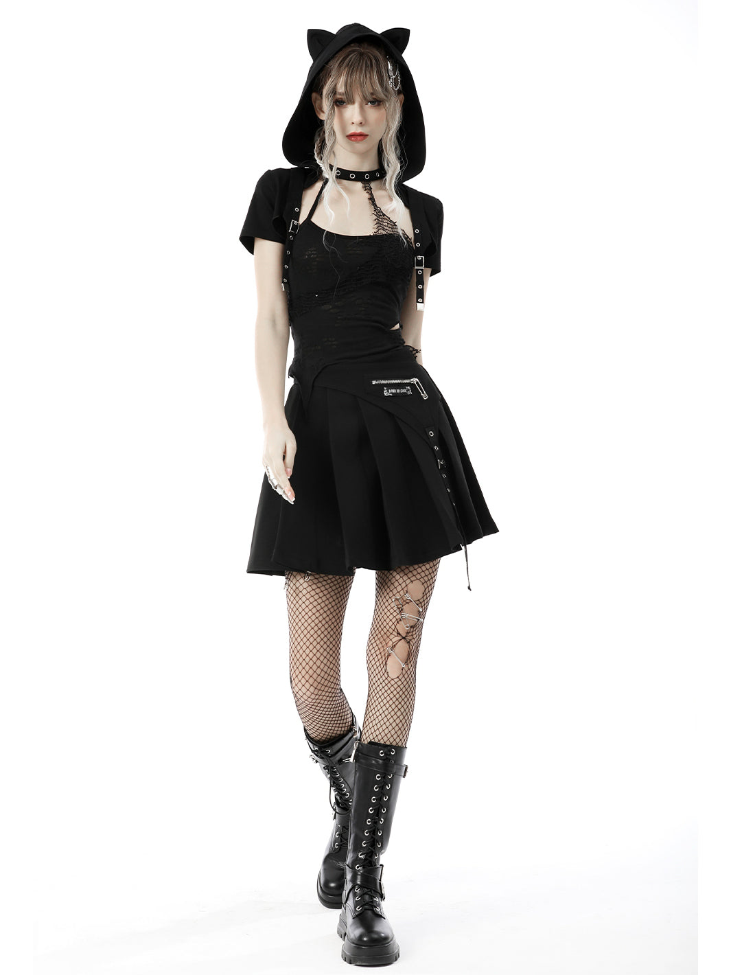 Prowl into the night with a little chaos on your shoulders. This cropped cape brings punk energy with a feline twist—complete with ears, batwing cut, and a tail tipped in a heart.