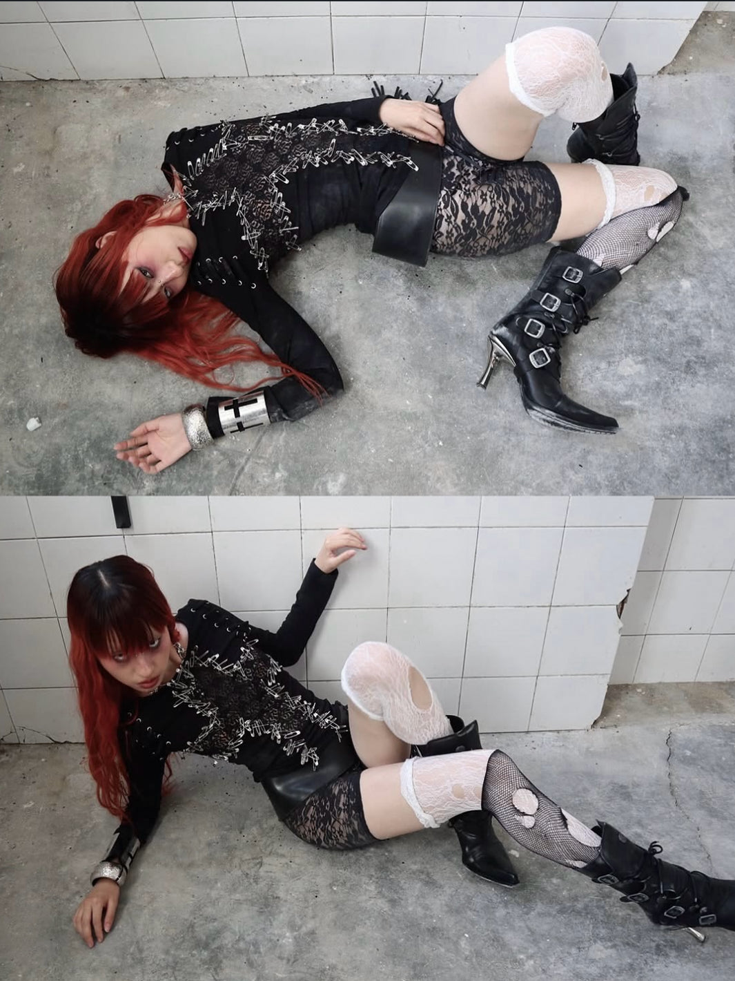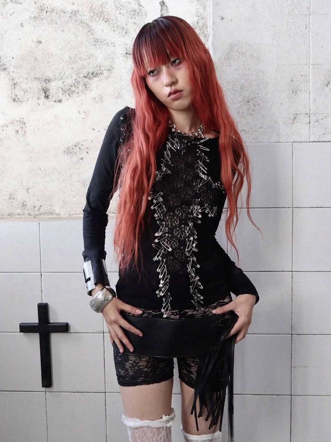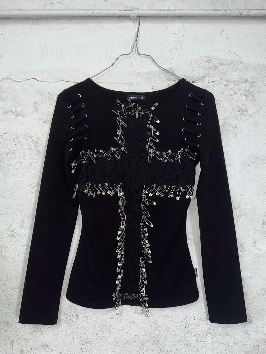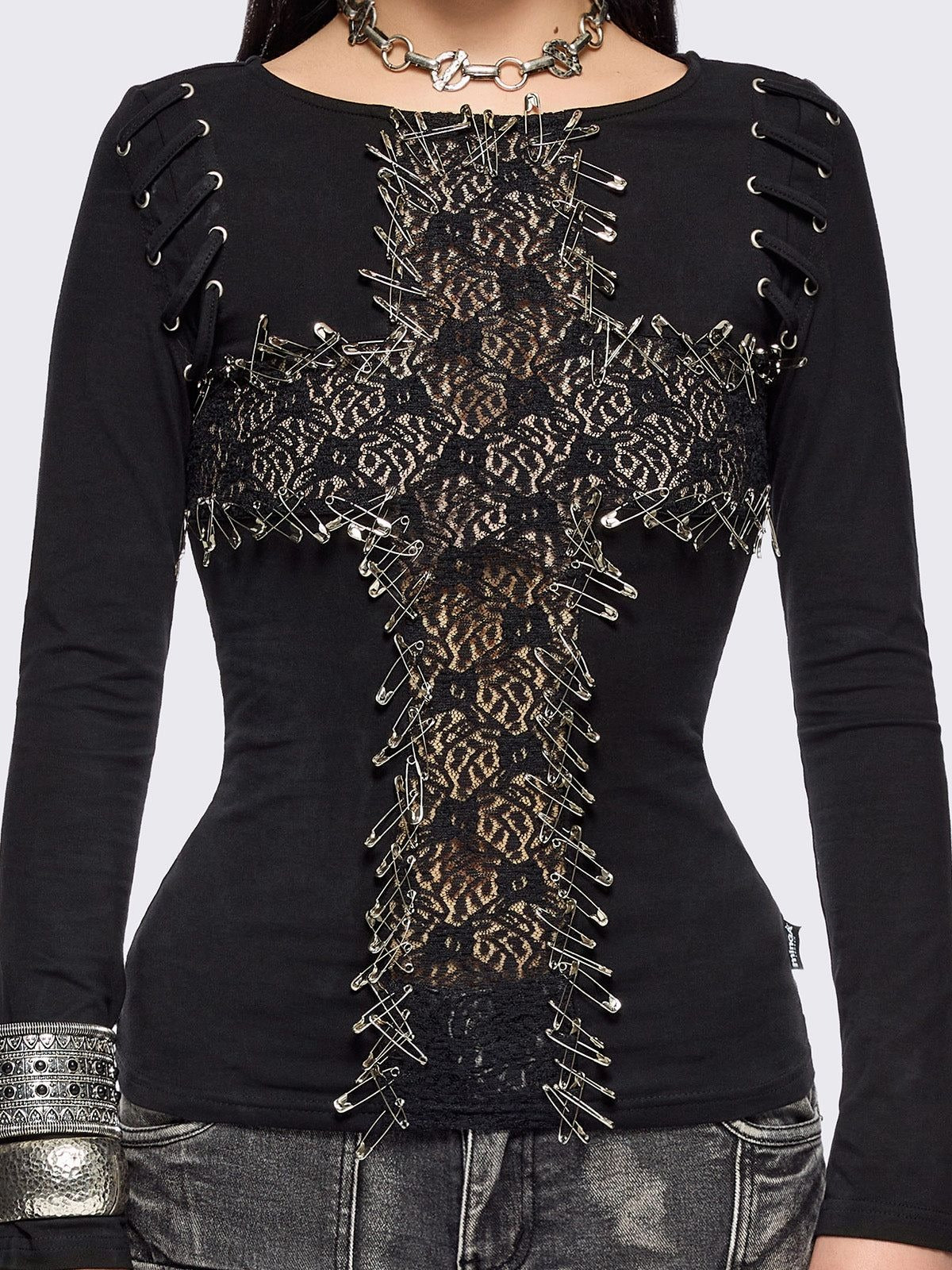 Basically illegal in boring wardrobes. A black long sleeve top with lace cross, safety pins, and lace-up details – built to break rules, not blend in.