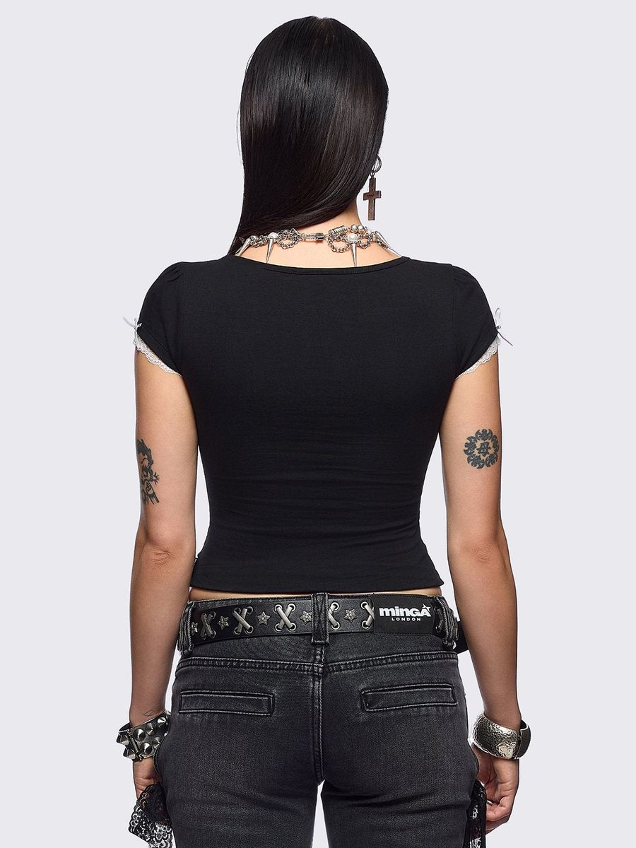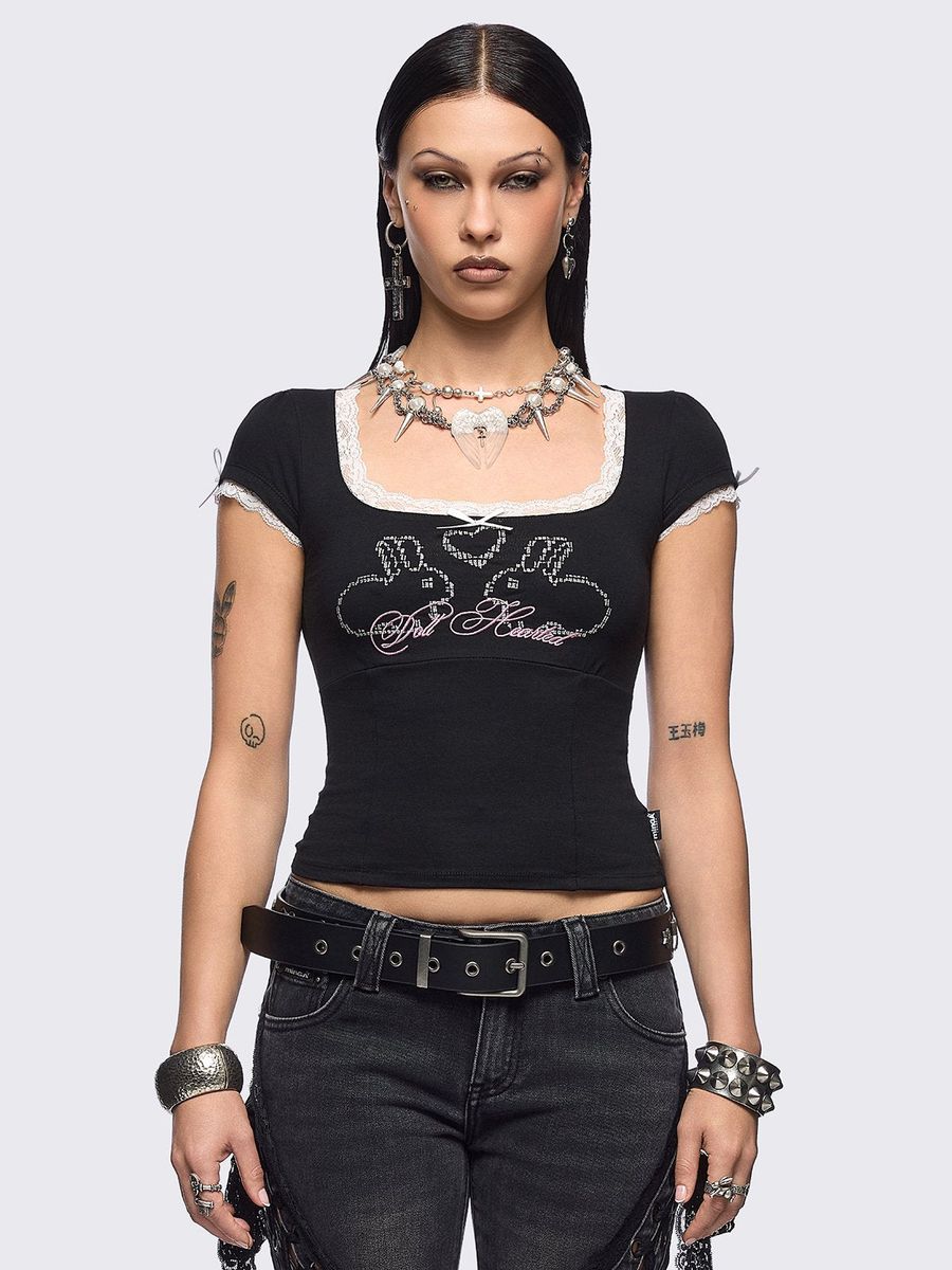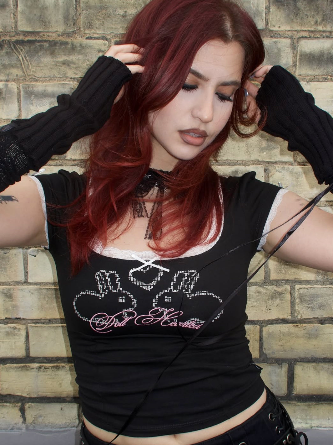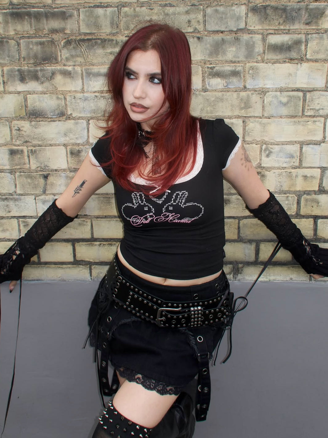 Raise your hand if you need this top. A black baby tee with “Doll hearted” embroidered bunnies, white lace trims, and bow details for the cutest grunge-girl moment.