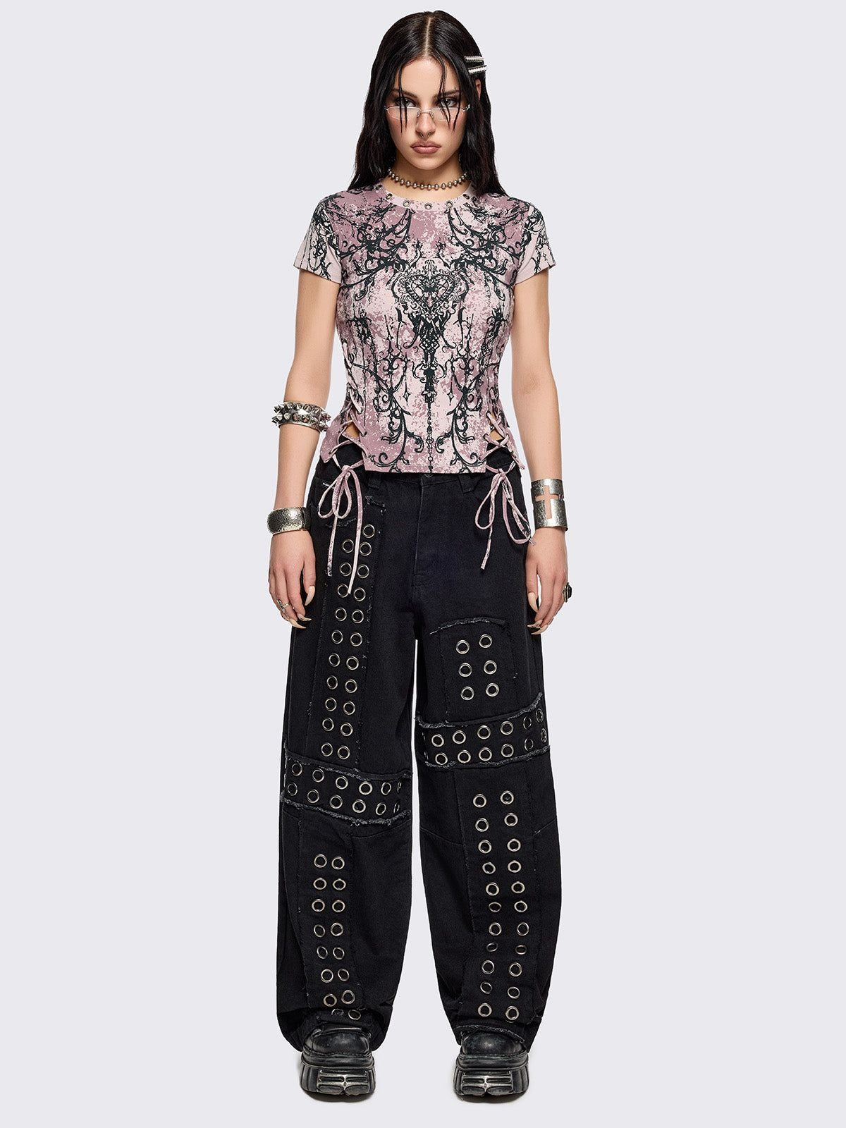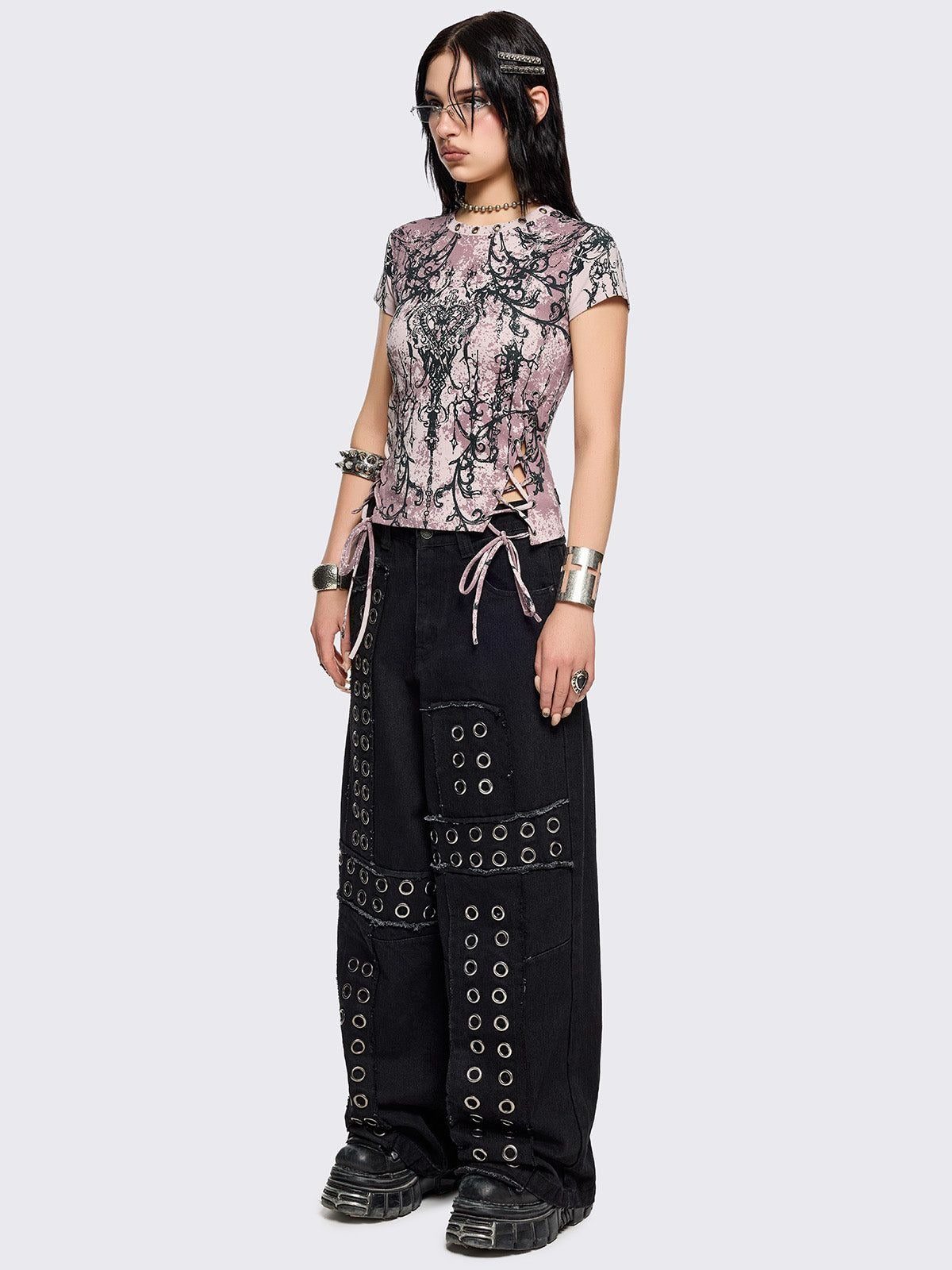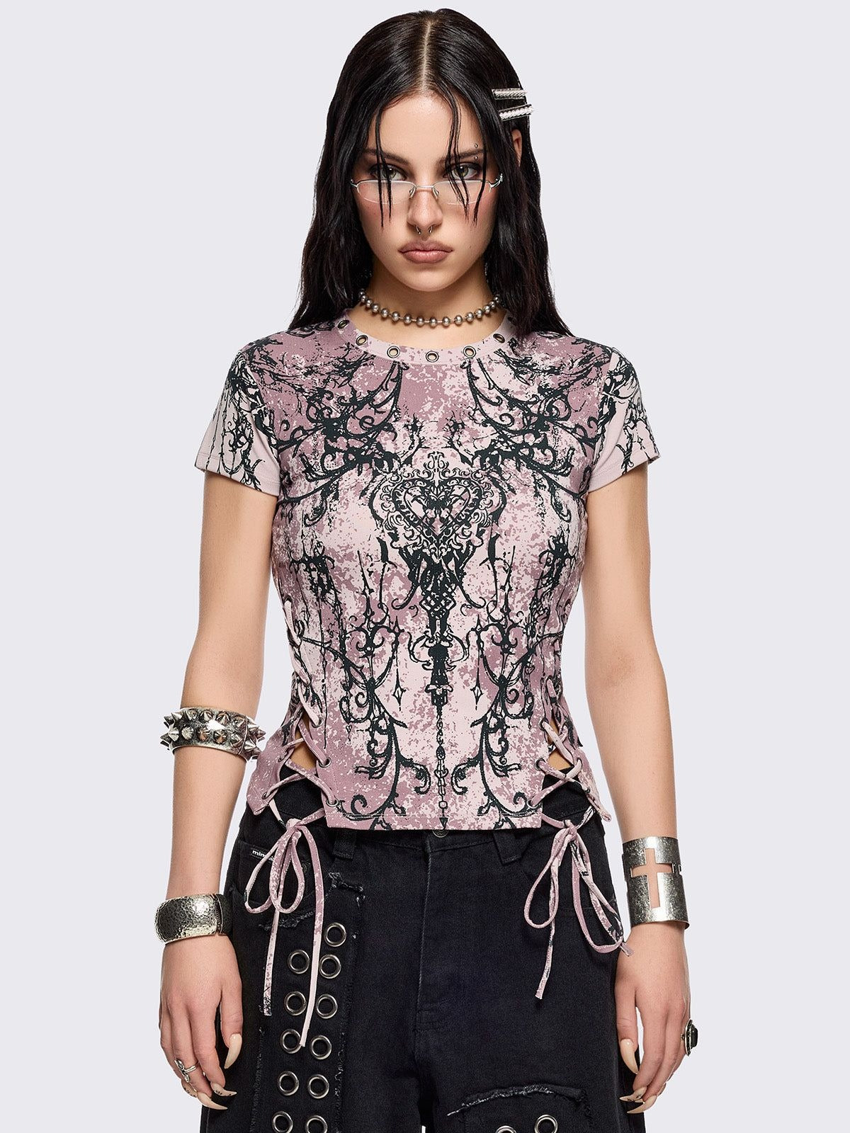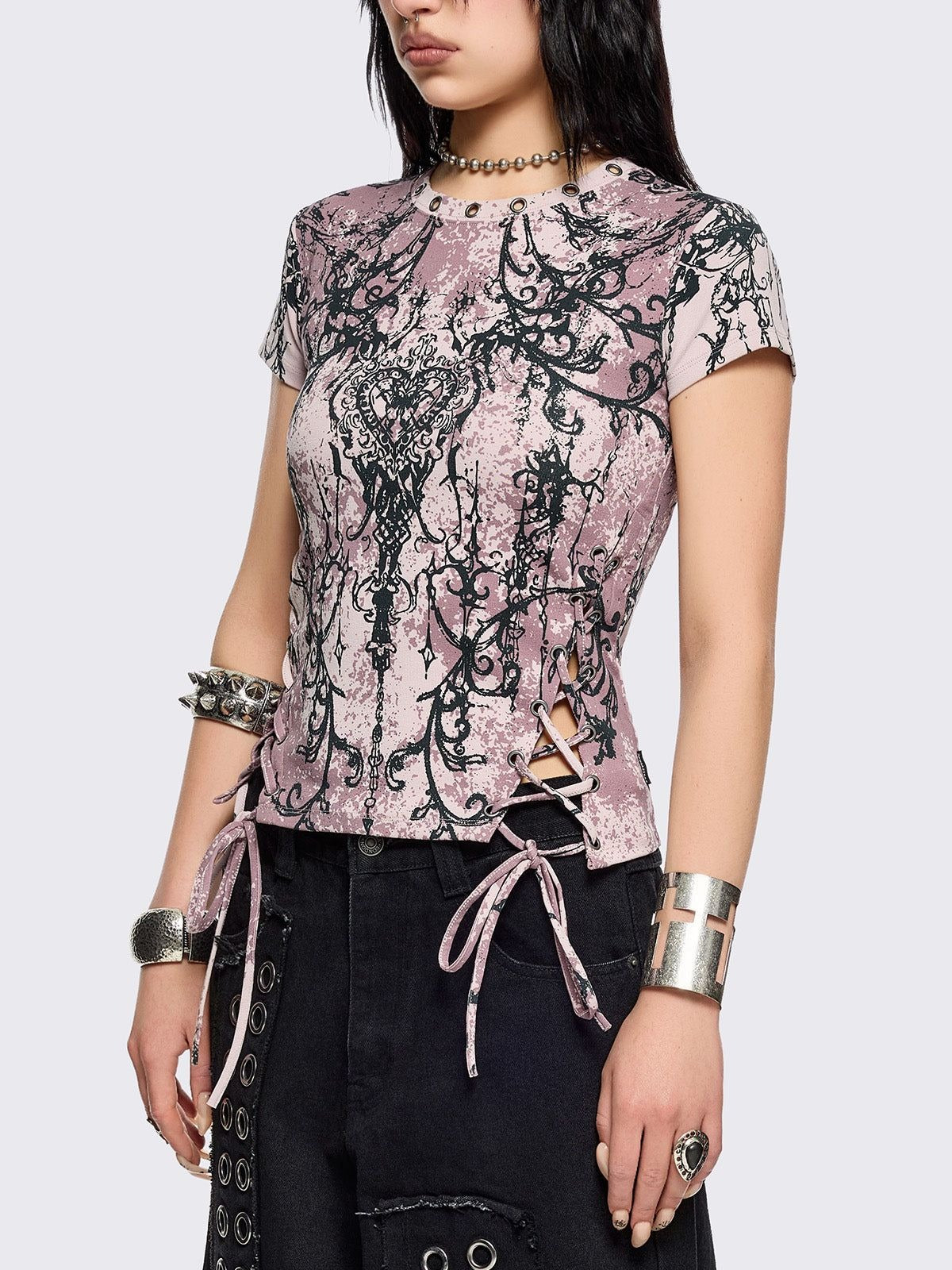 No heart? No problem. This pink tie dye baby tee comes with a grunge heart print, lace-up sides, and eyelet details for that perfect mix of pretty and tough.