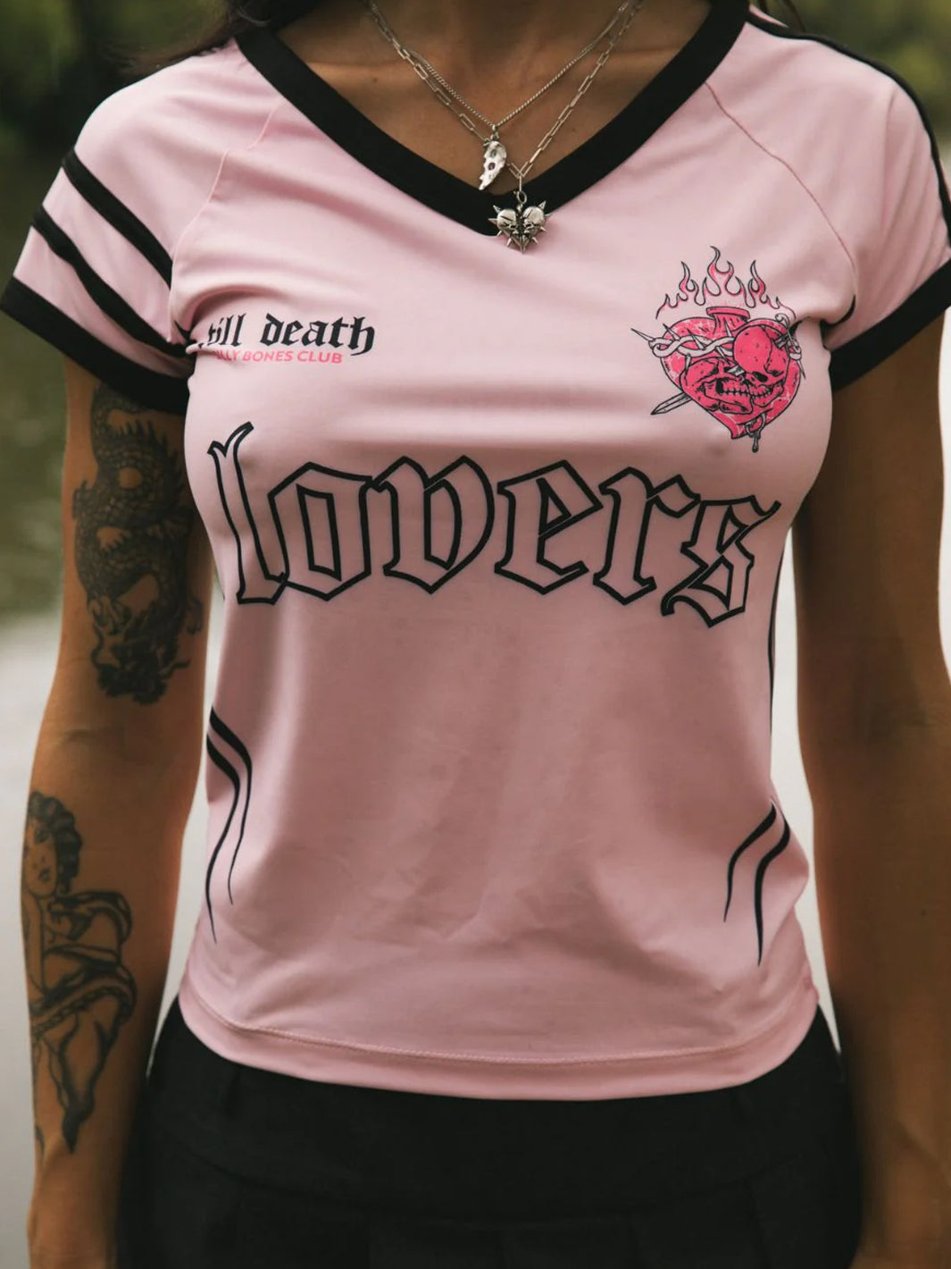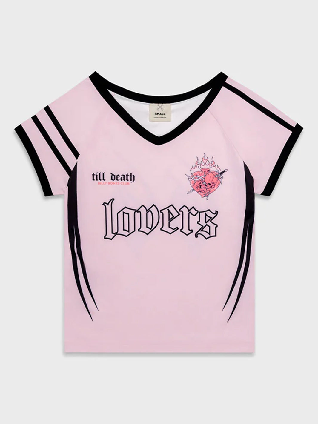 We play better away. The Lovers Away Baby Jersey is here in a high-contrast black and pink colourway with a custom all-over football stripe print. A fresh take on our fan-fave jerseys — reworked into a cute baby tee fit.