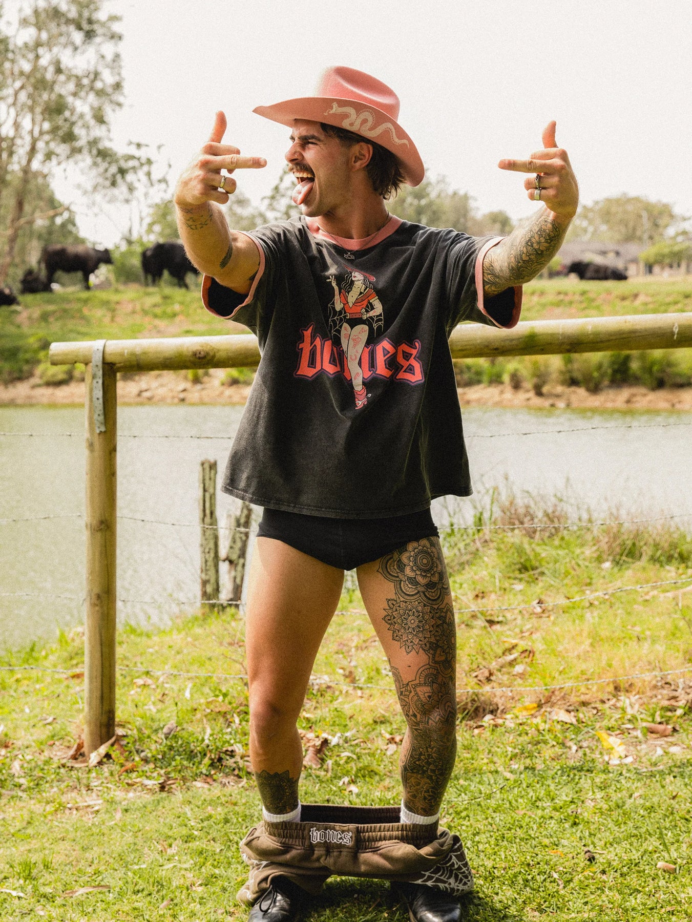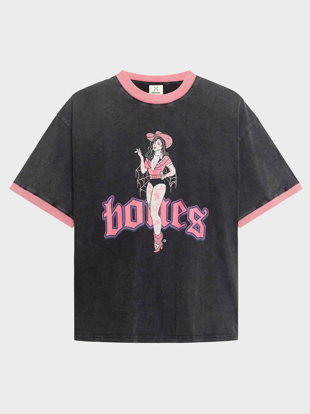 Hit the strip in the Neon Cowgirl Ringer - a fresh take on Billy Bones bestselling style. This boxy ringer fit features light pink contrast cuffs and neck ribbing, finished with a Neon Cowgirl Bones graphic front and centre.