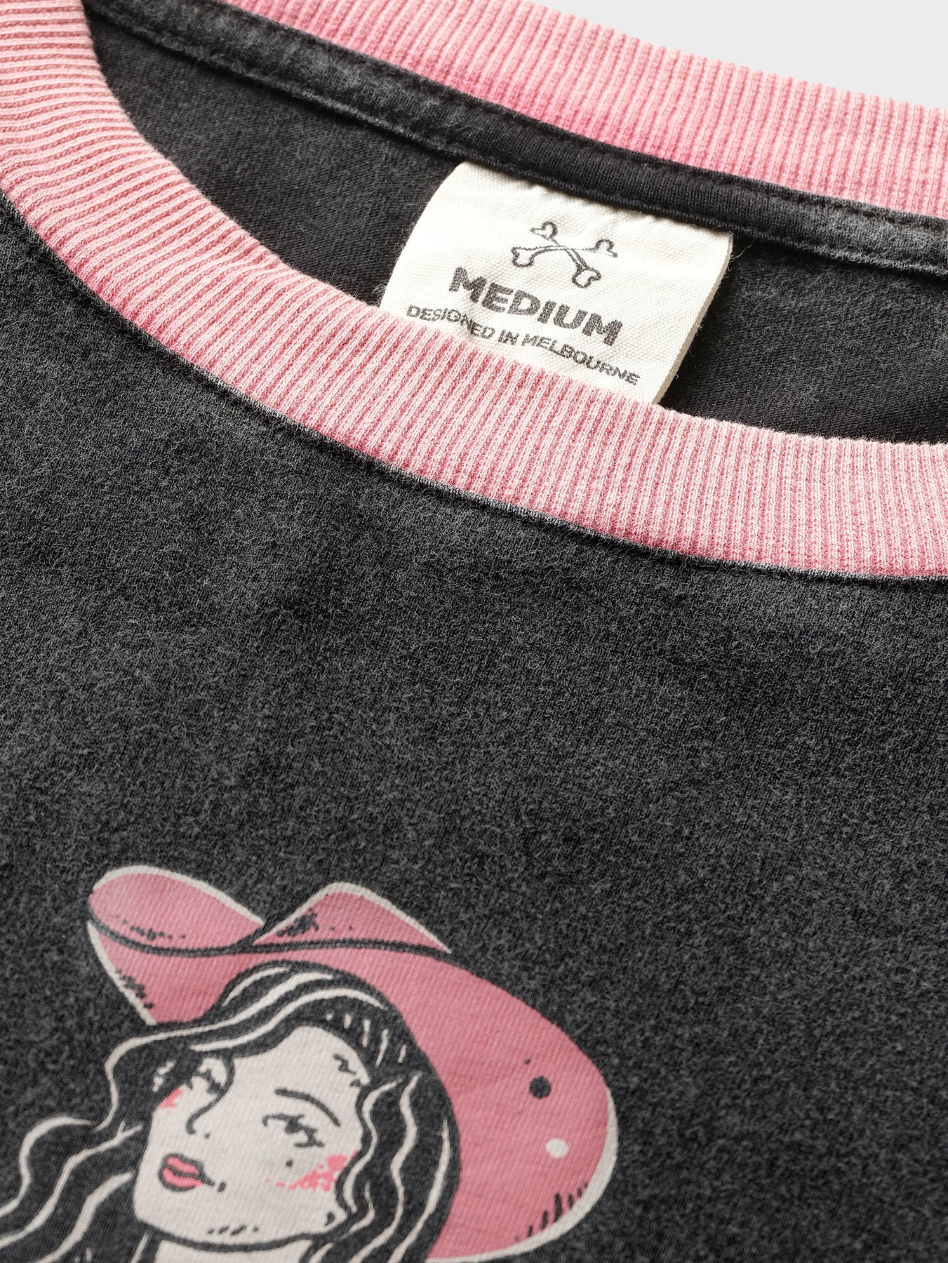 NEON COWGIRL RINGER TEE - WASHED BLACK/PINK