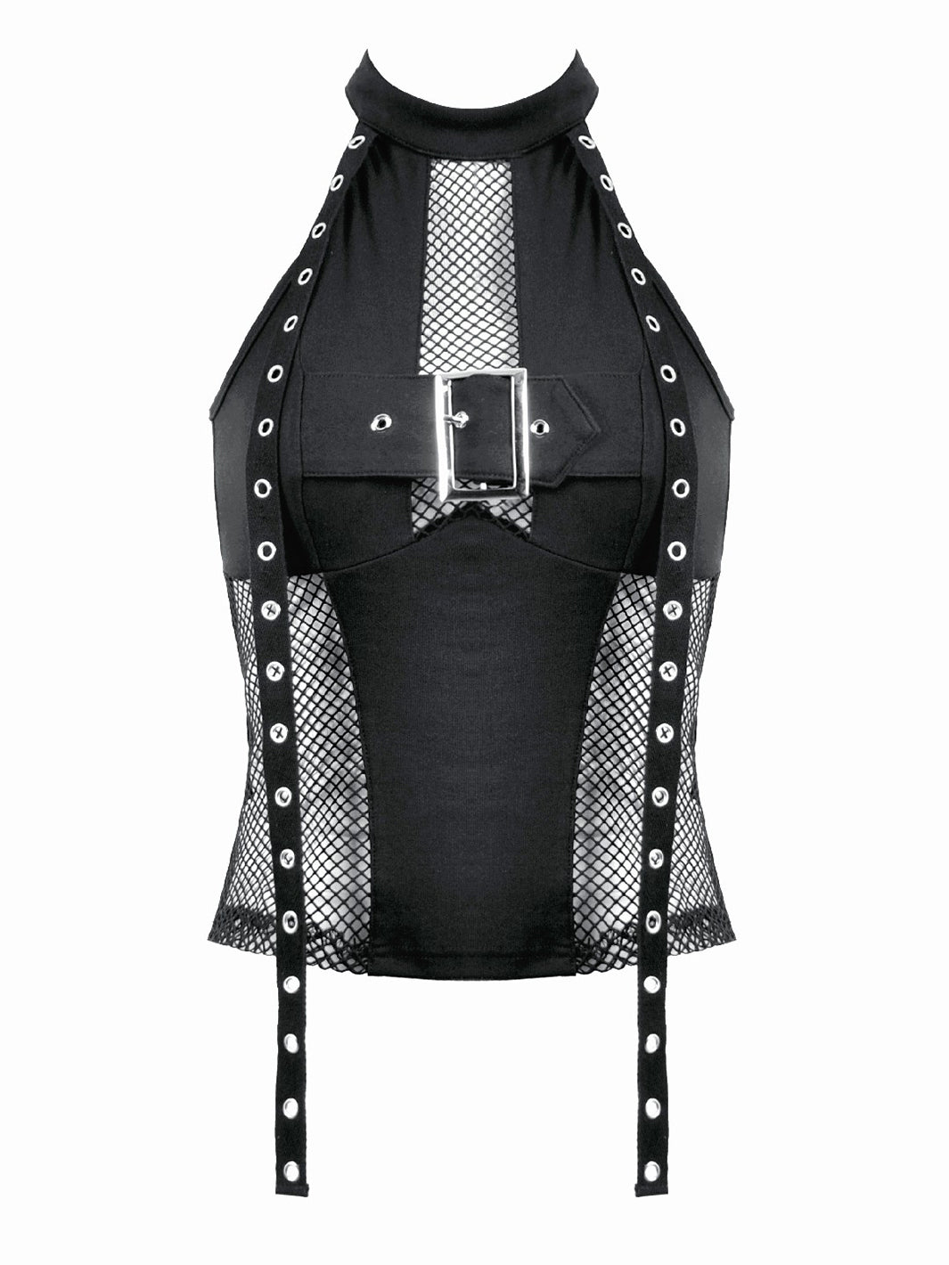 - Black halter-style top with mesh paneling