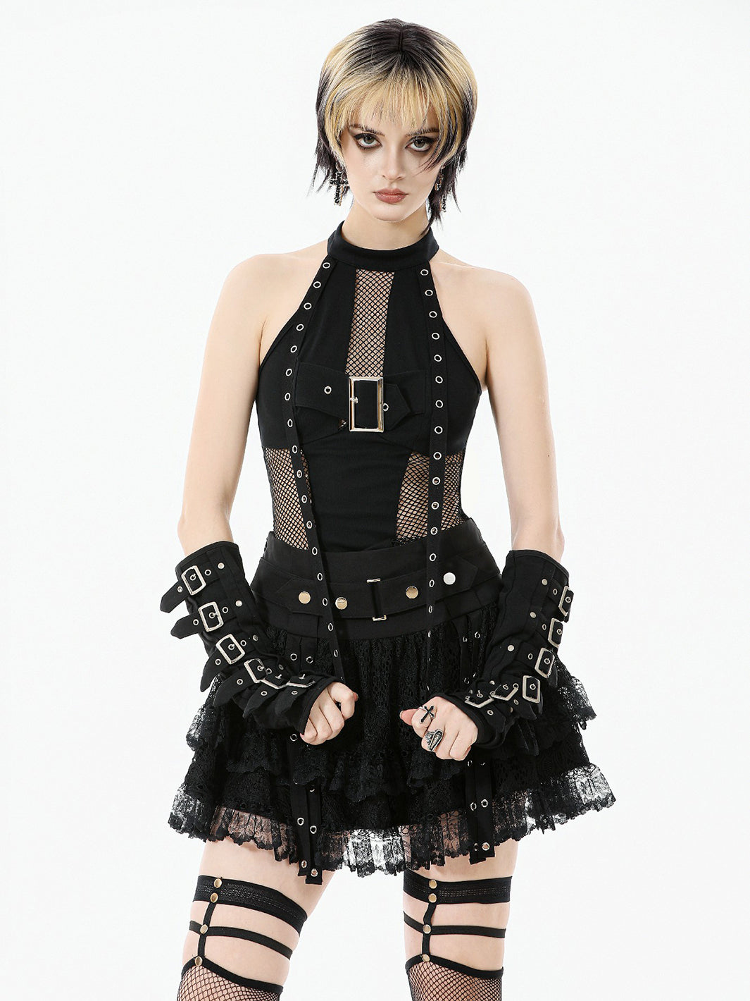 Turn heads from dusk till dawn in the Nightshade Buckle Top. This versatile halter delivers instant punk edge with bold cutouts and hardware details.