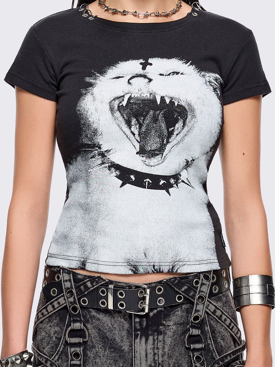 A graphic tee for every mood and each of your nine lives. Black, cropped, and topped with a goth cat print and O-ring details for that perfect dark-cute vibe.