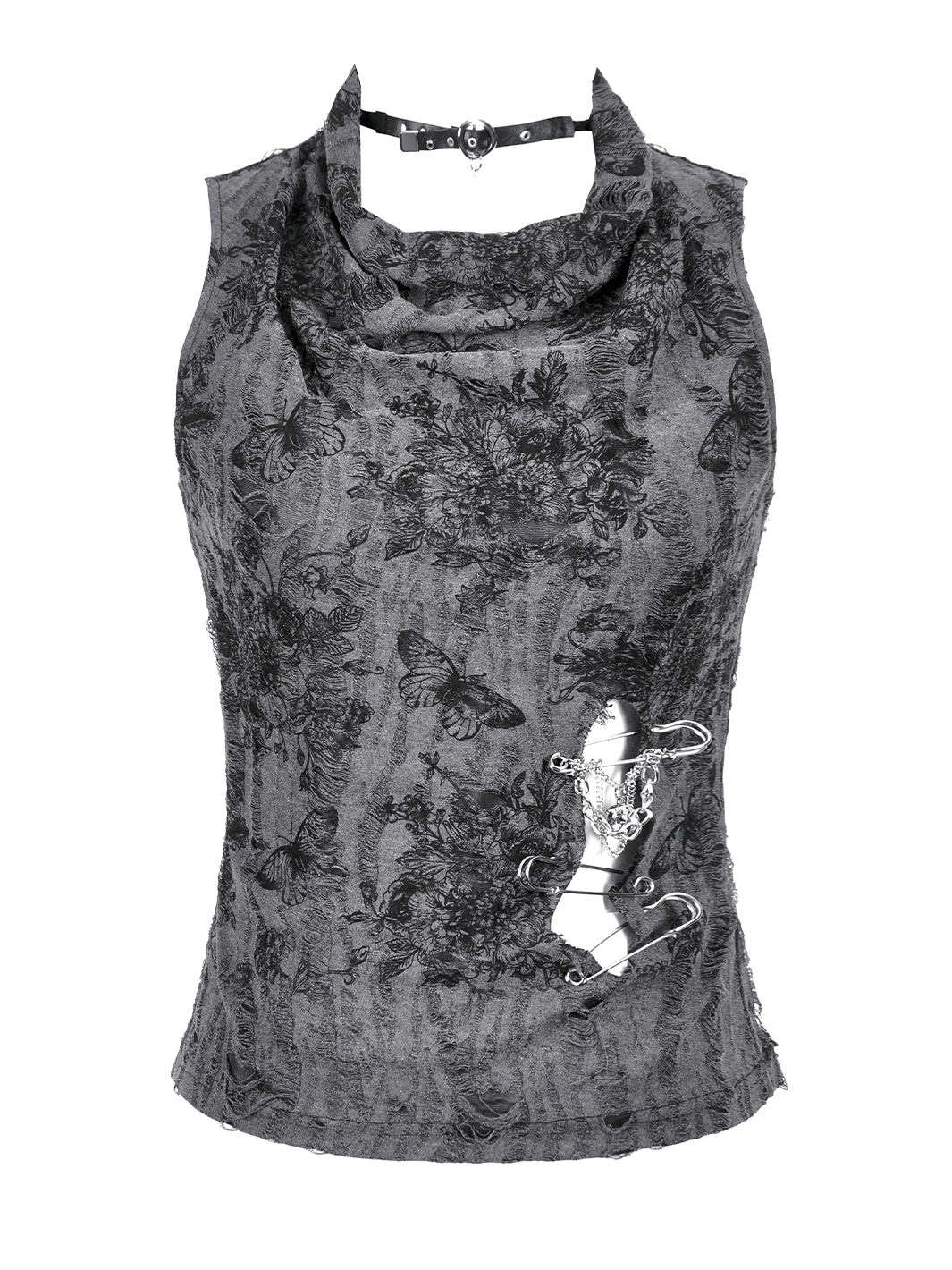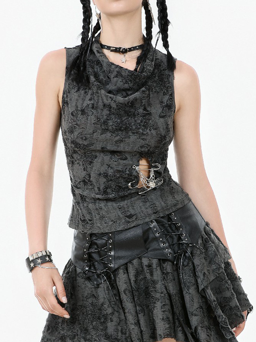 Part romance, part riot. This sleeveless top pairs a draped neckline with shredded details, safety pin hardware, and a pentagram choker strap for punky goth energy. Pair with the matching skirt for pure pixie perfection.