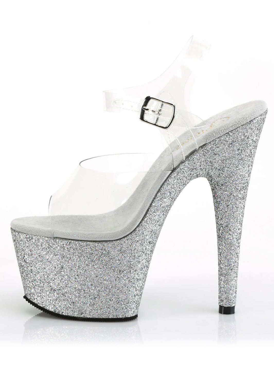 7"" (178mm) Heel, 2 3/4"" (70mm) Platform Ankle Strap Sandal Featuring Holographic Mini Glitter Wrapped Platform Bottom