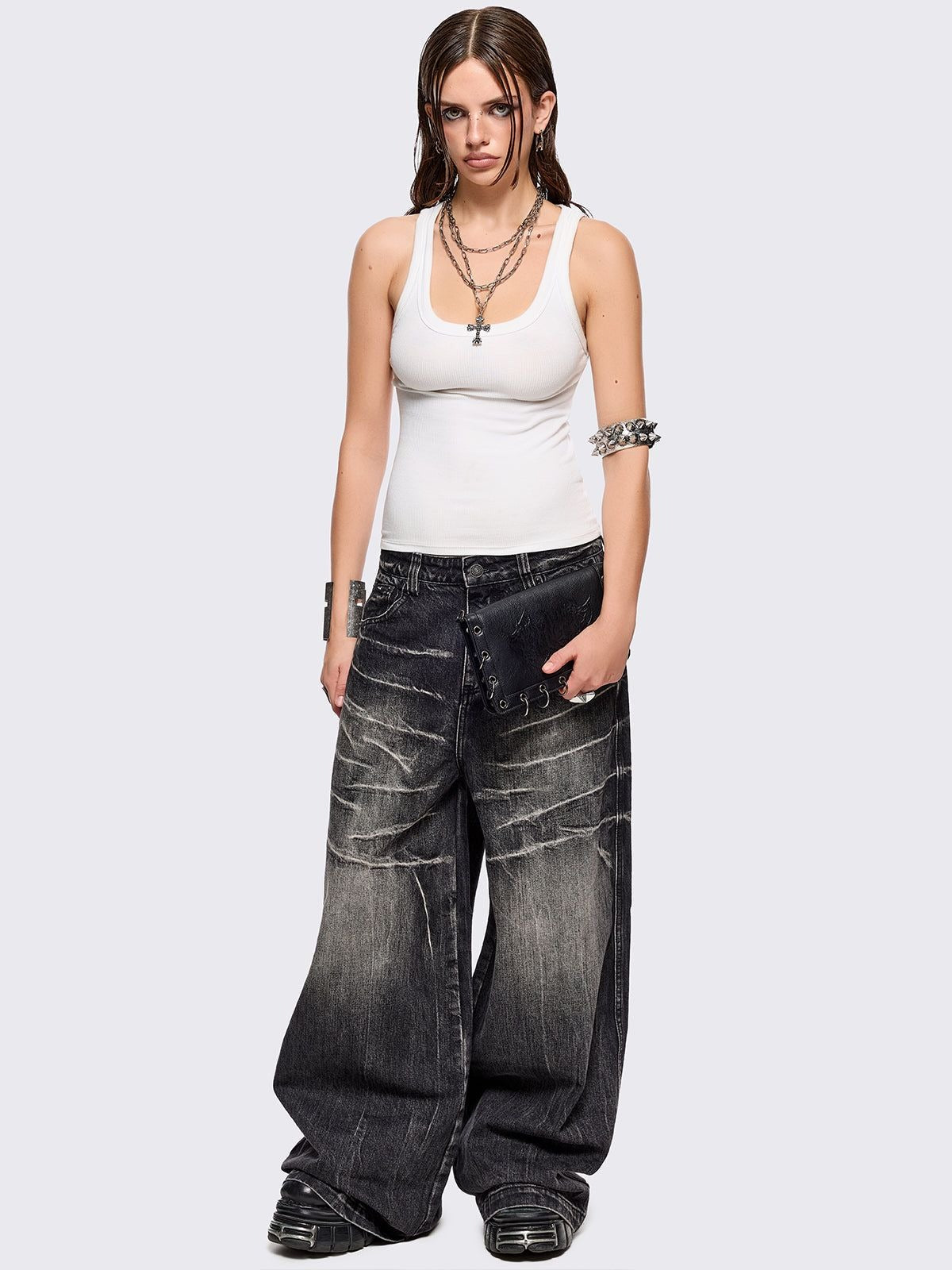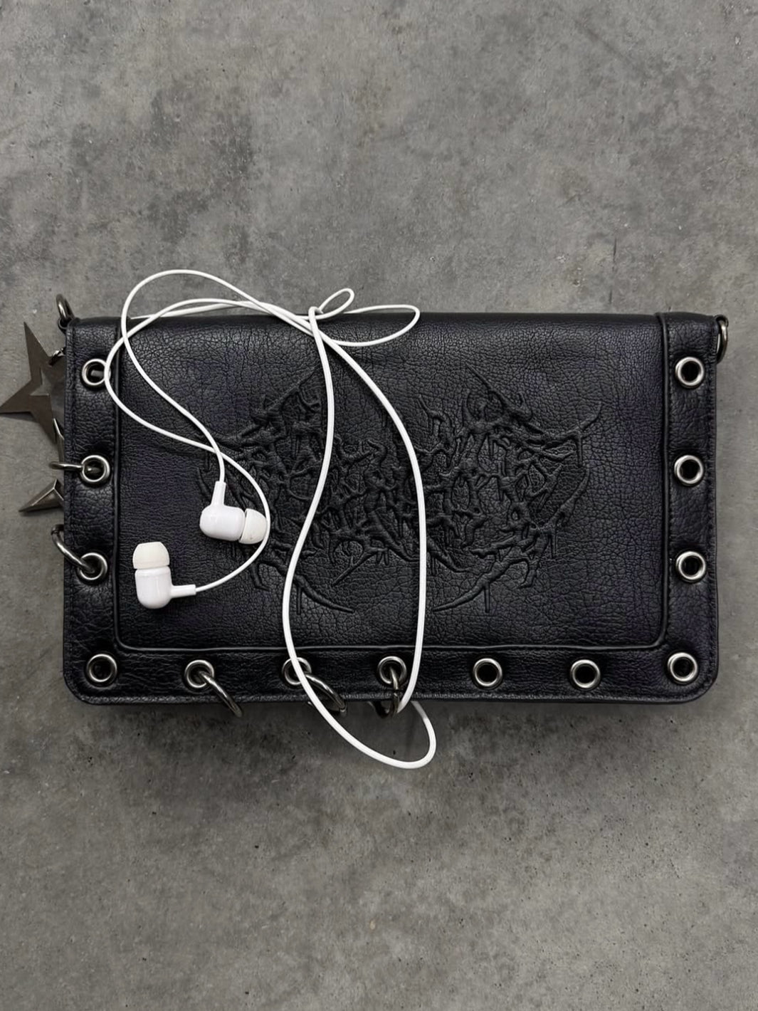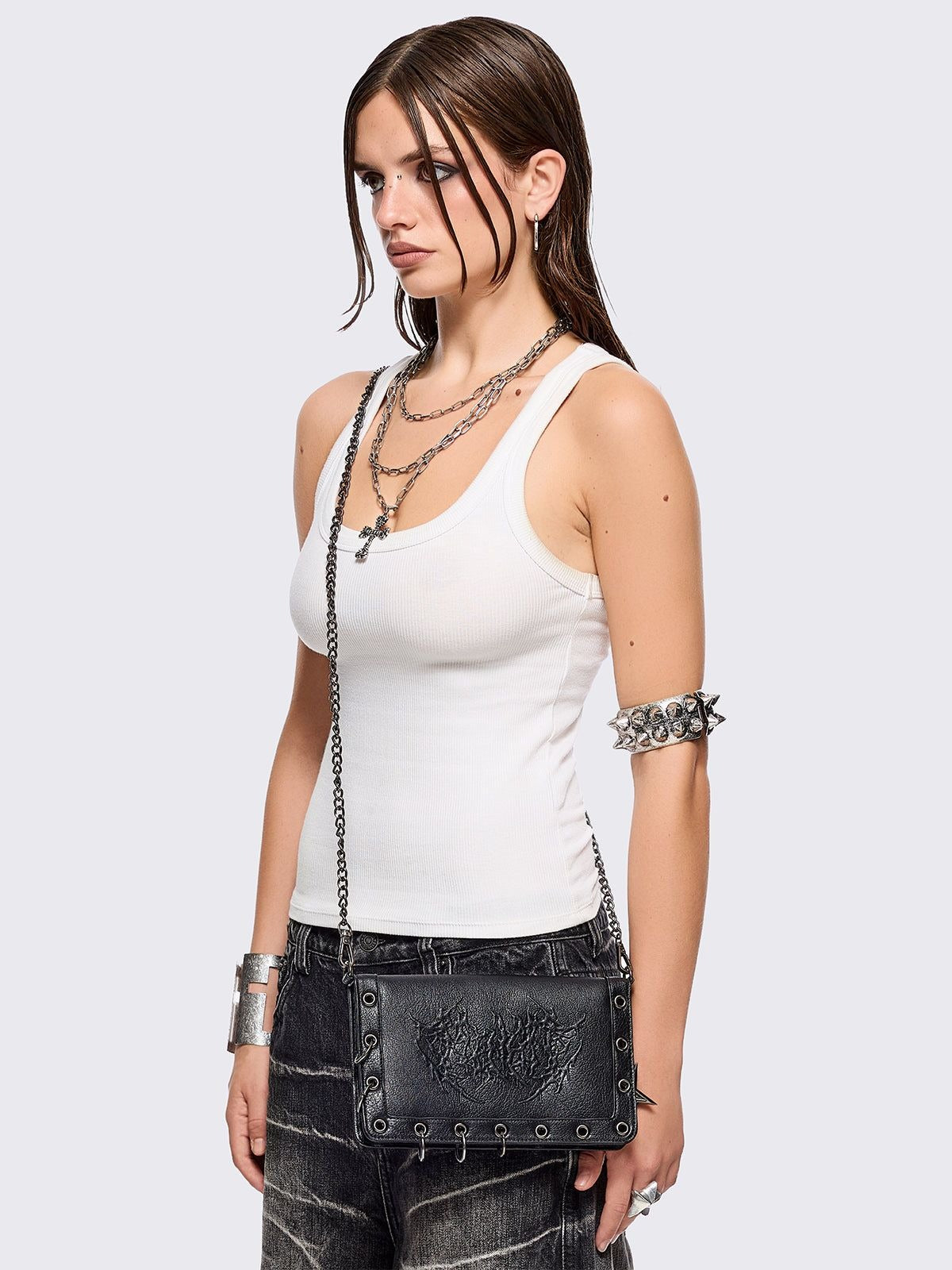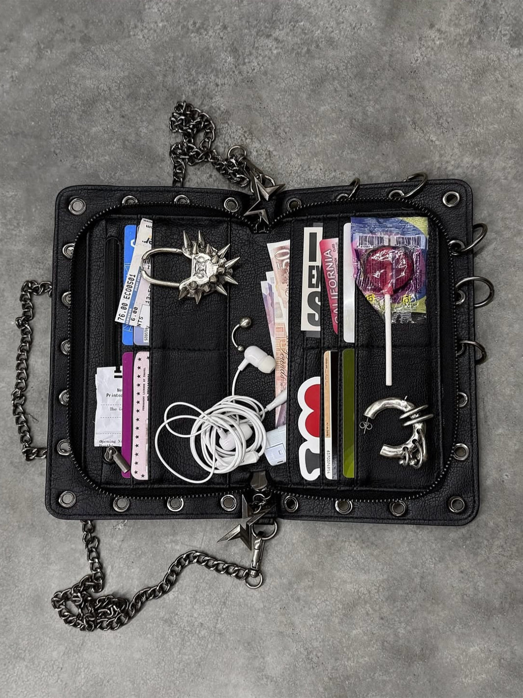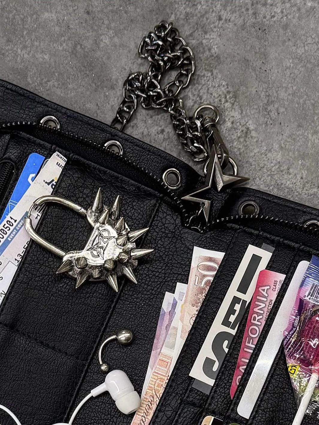 Damn, Minga London also know how to make bold wallets. This black faux leather piece comes embossed with sigilism graphics, finished with silver eyelets, O-ring details, and a removable chain for hands-free edge.
