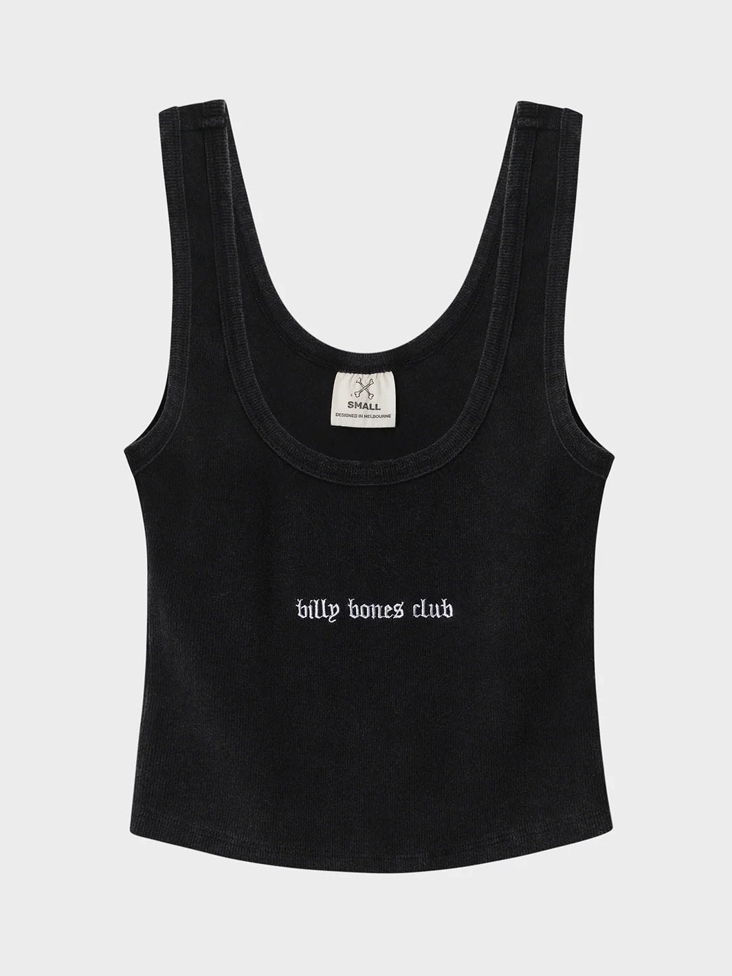 The Backbone Low Crop - Billy Bones' classic cropped tank, now in washed black with front embroidery. Comfy, flattering, and made to be worn on repeat.