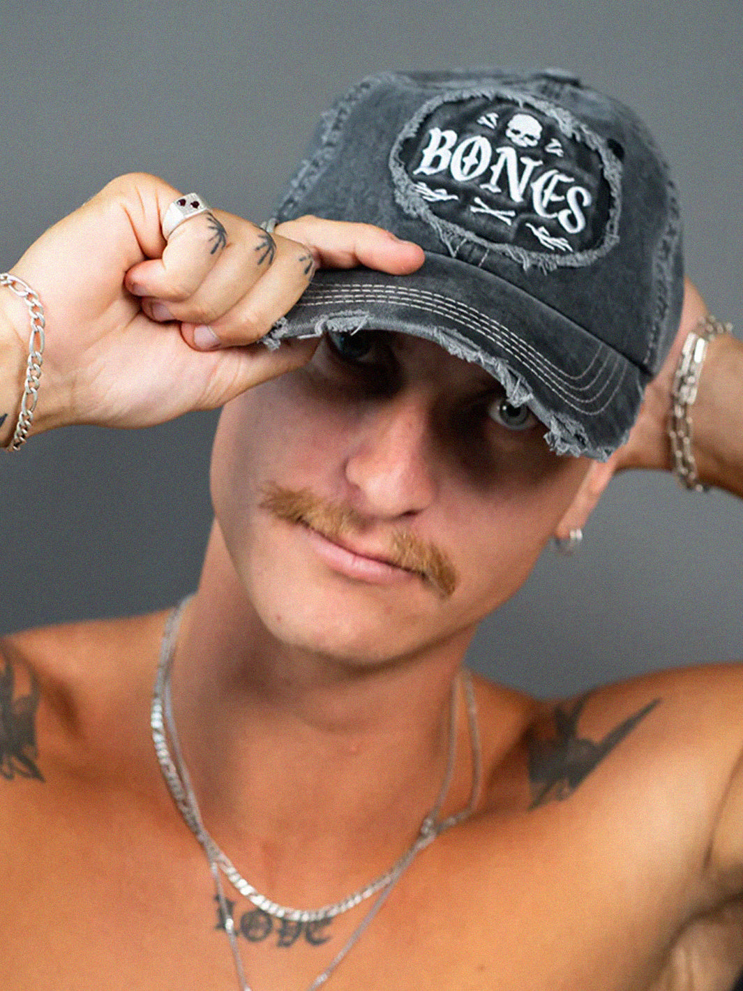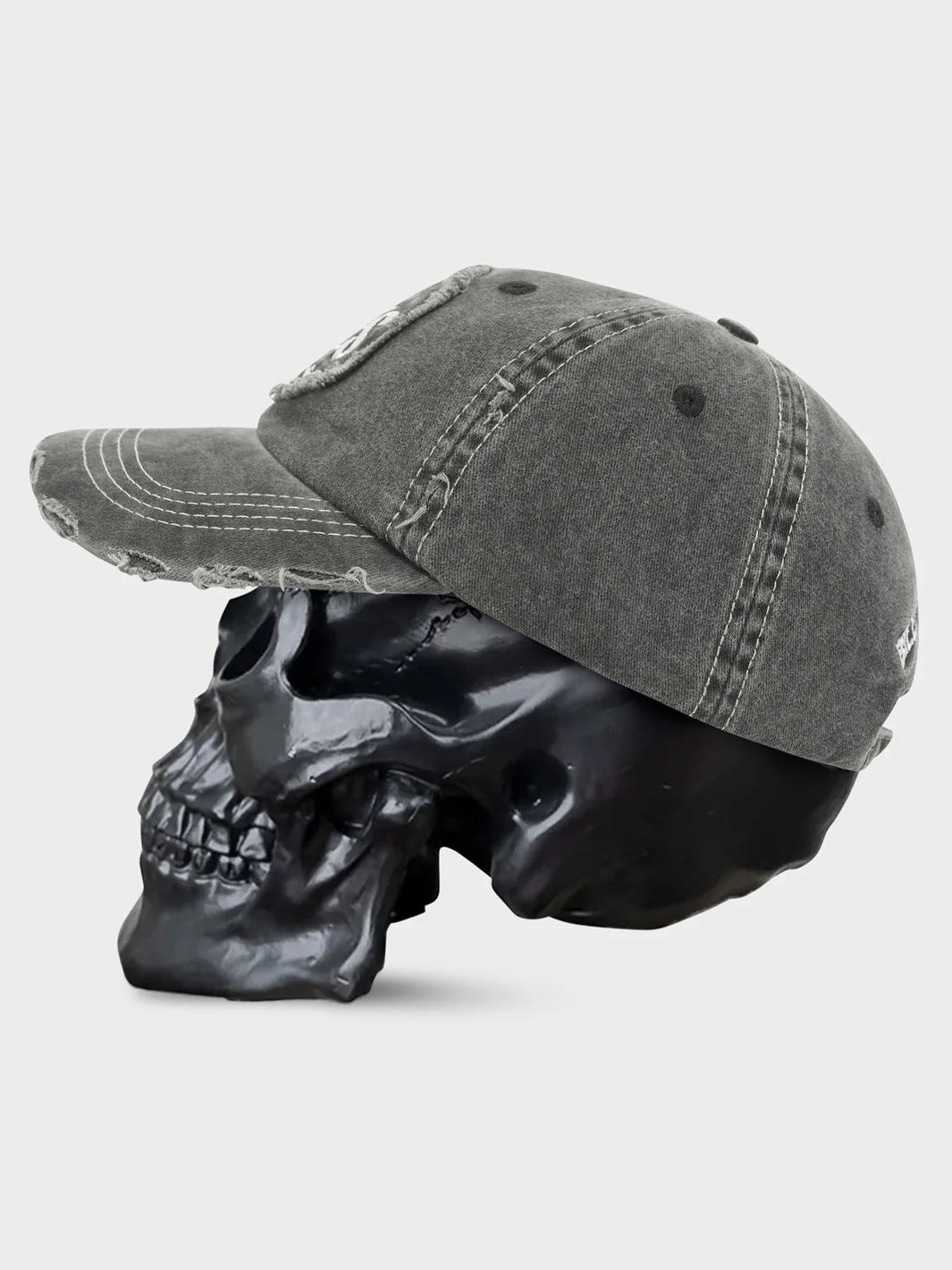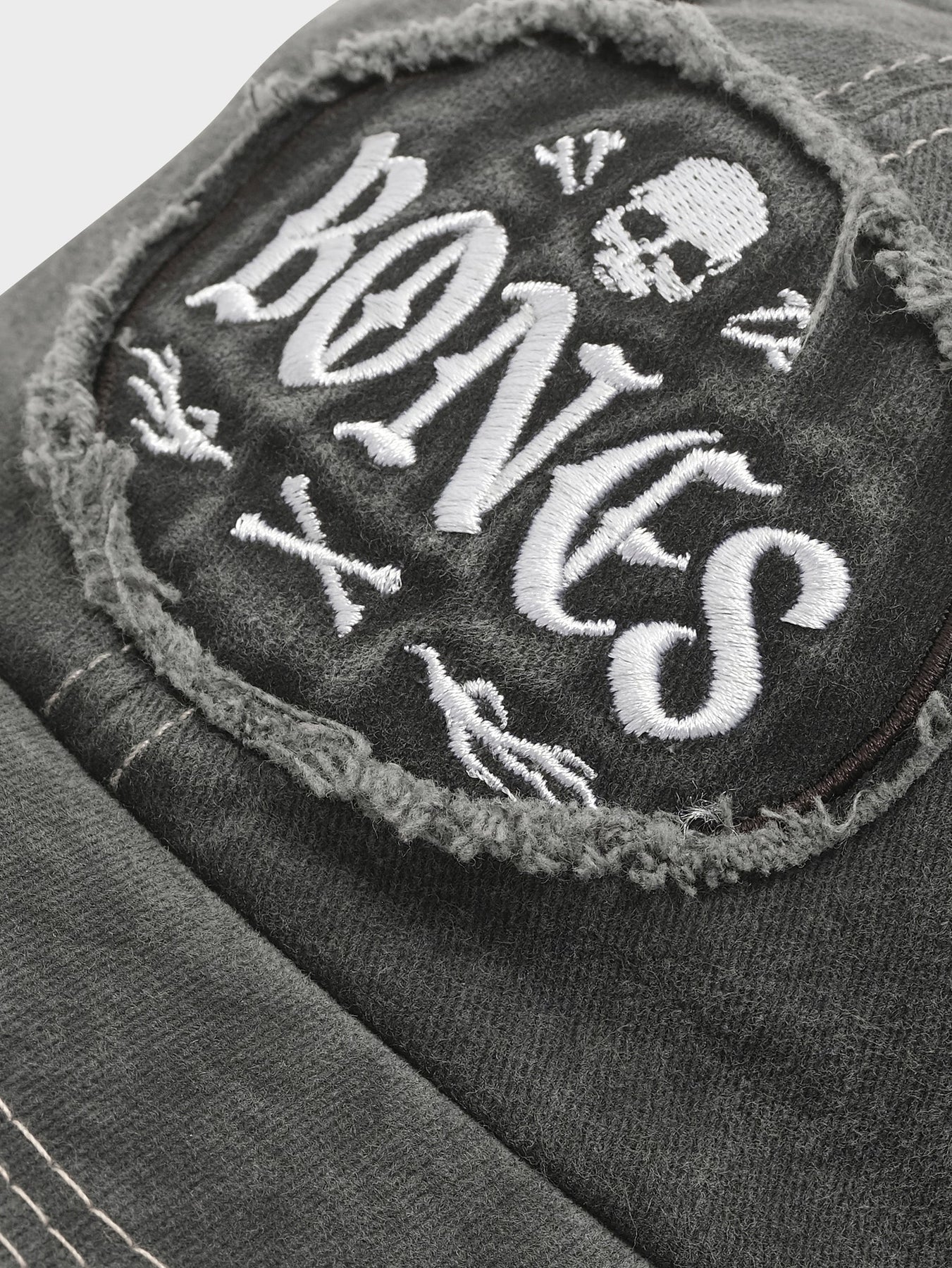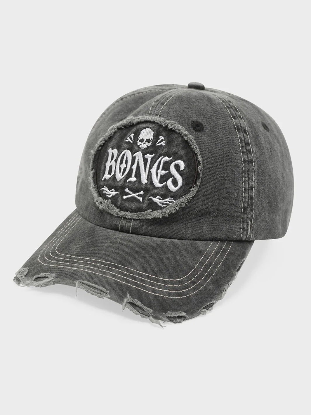 This cap is built for trouble - washed black with raw edges, an embroidered skull patch and classic Bones branding.