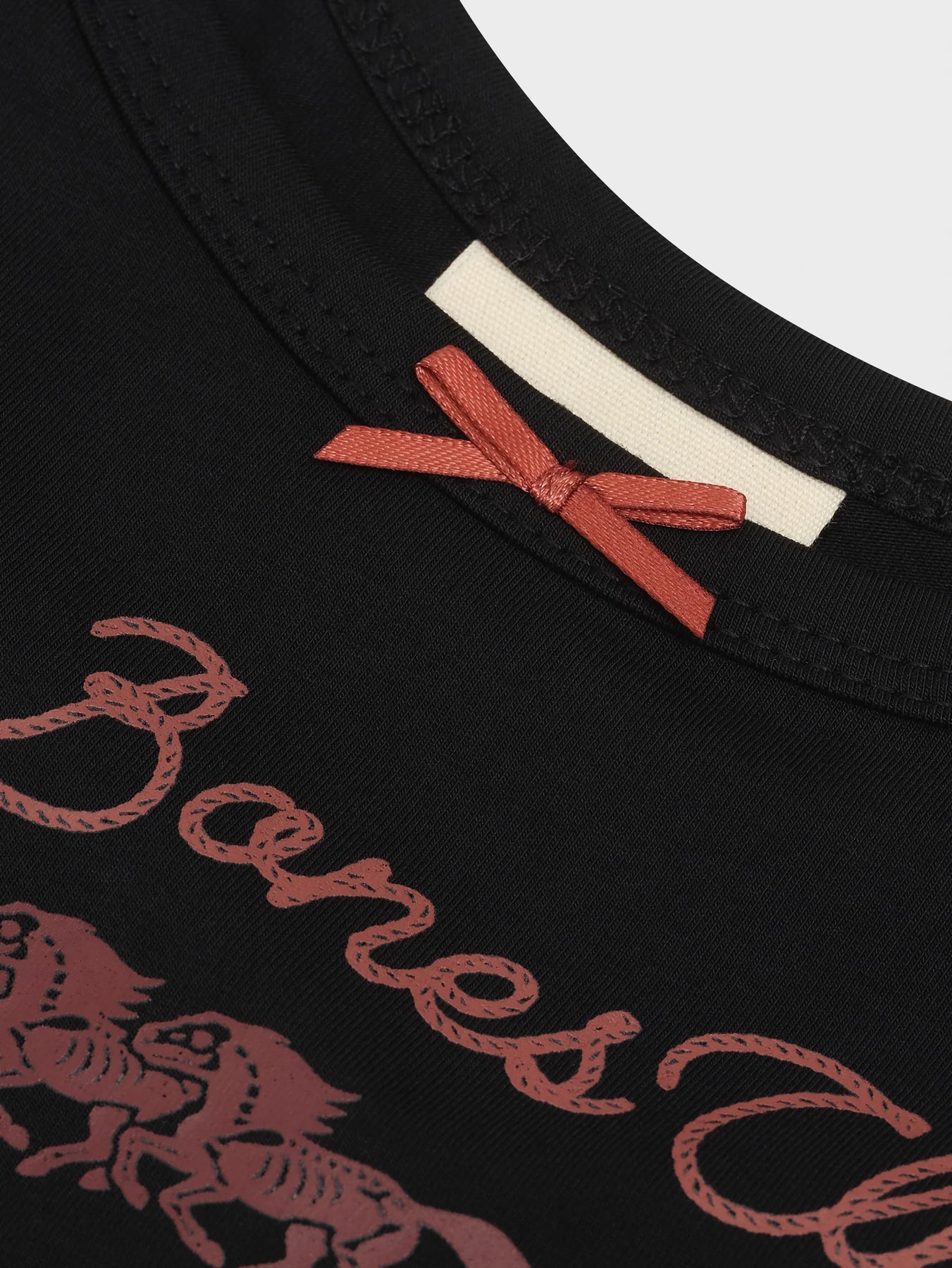 Hold your bloody horses! This one’s for the cowgirls who need a gentle reminder. A fitted black crop with a bold logo screen print and a sweet bow on the neck to keep it cheeky.