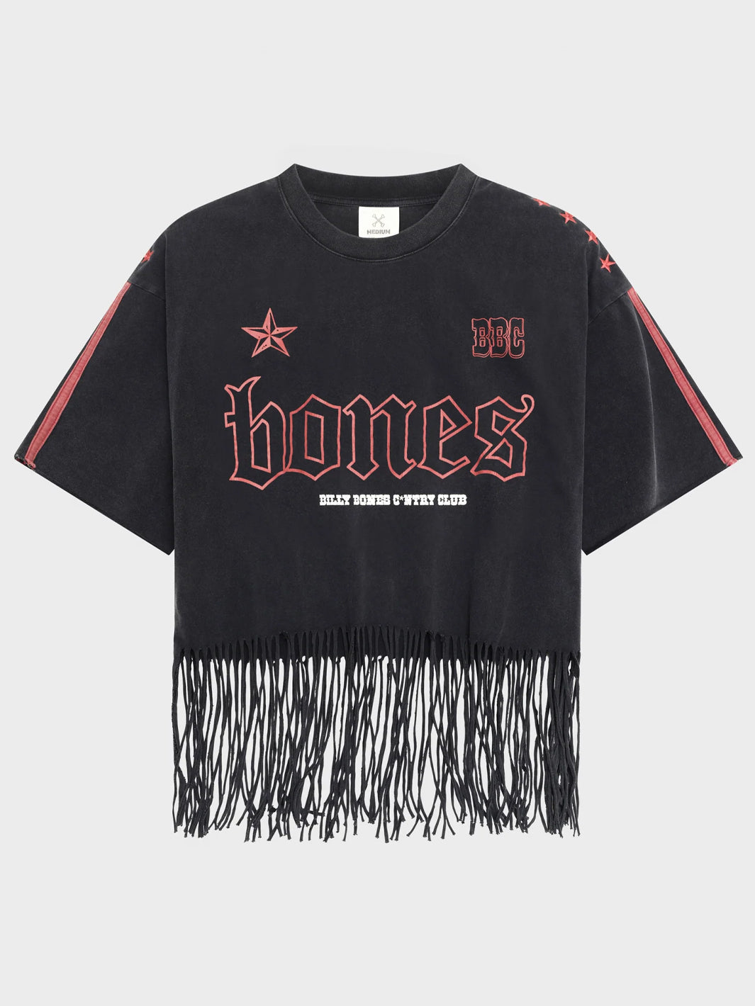 Frayed and stacked just how we like it. The Frayed Stacked Tee features layered logos on a cropped, tassel-frayed hem with striped sleeve panels. Finished in washed black cotton for that worn-in look.