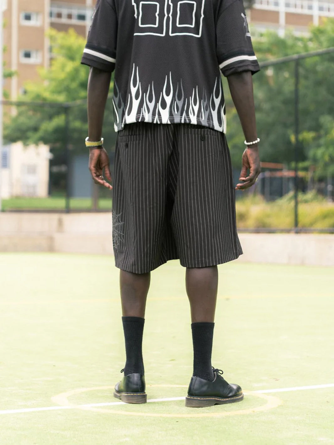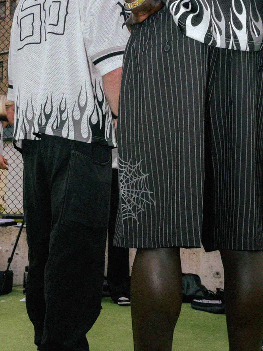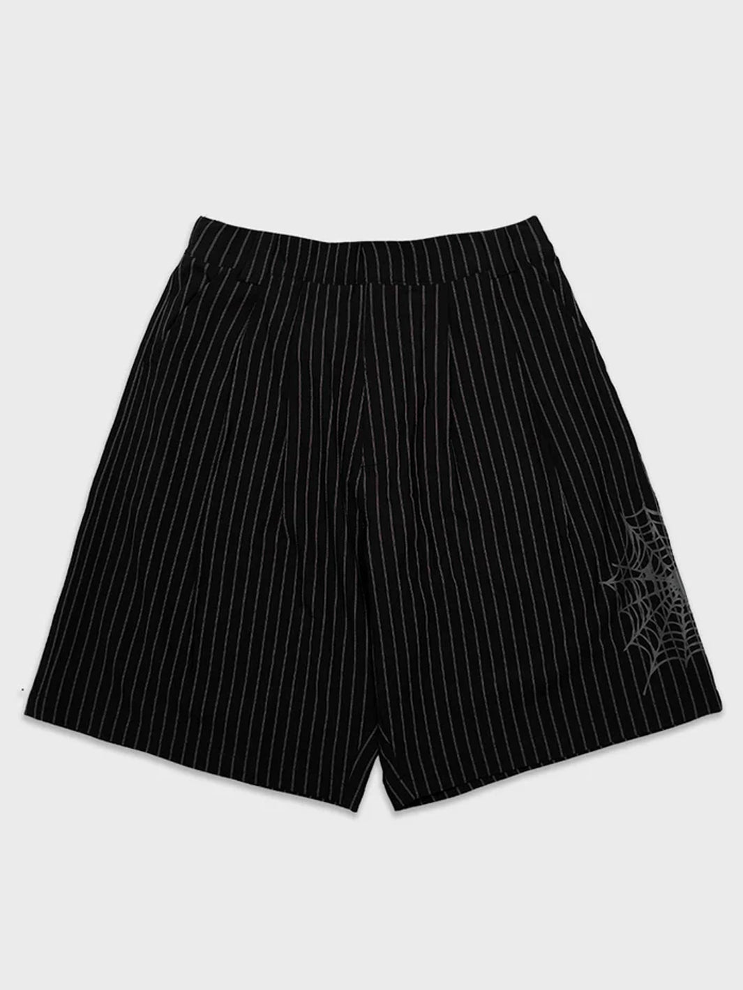 The Pinstriped Webbed Pleated Shorts, featuring a subtle spider web screen printed on the left side. Made out of a poly-mix for a lightweight, breezy feel. Perfect for Summer and looking the part for your next try out or job interview.