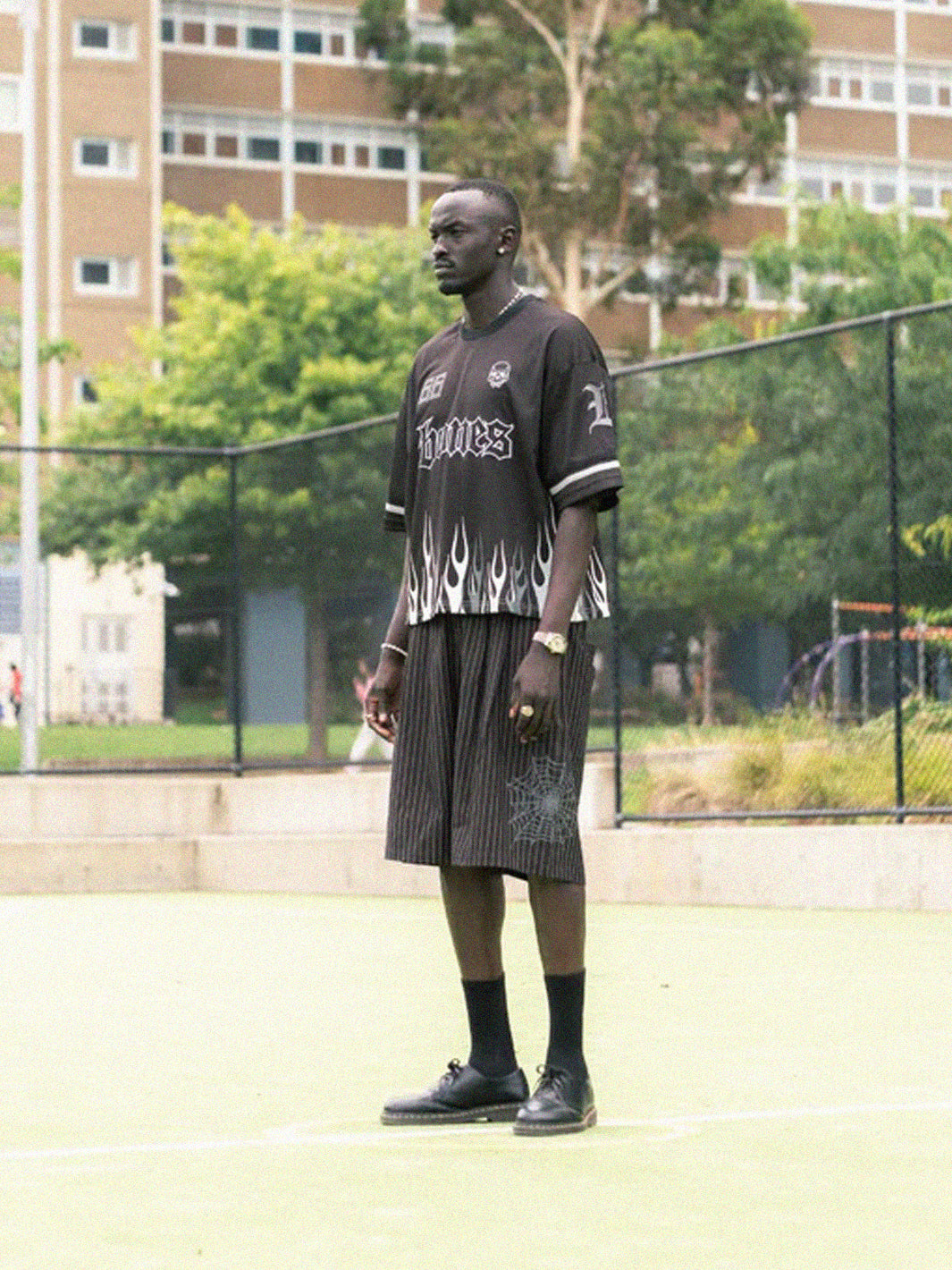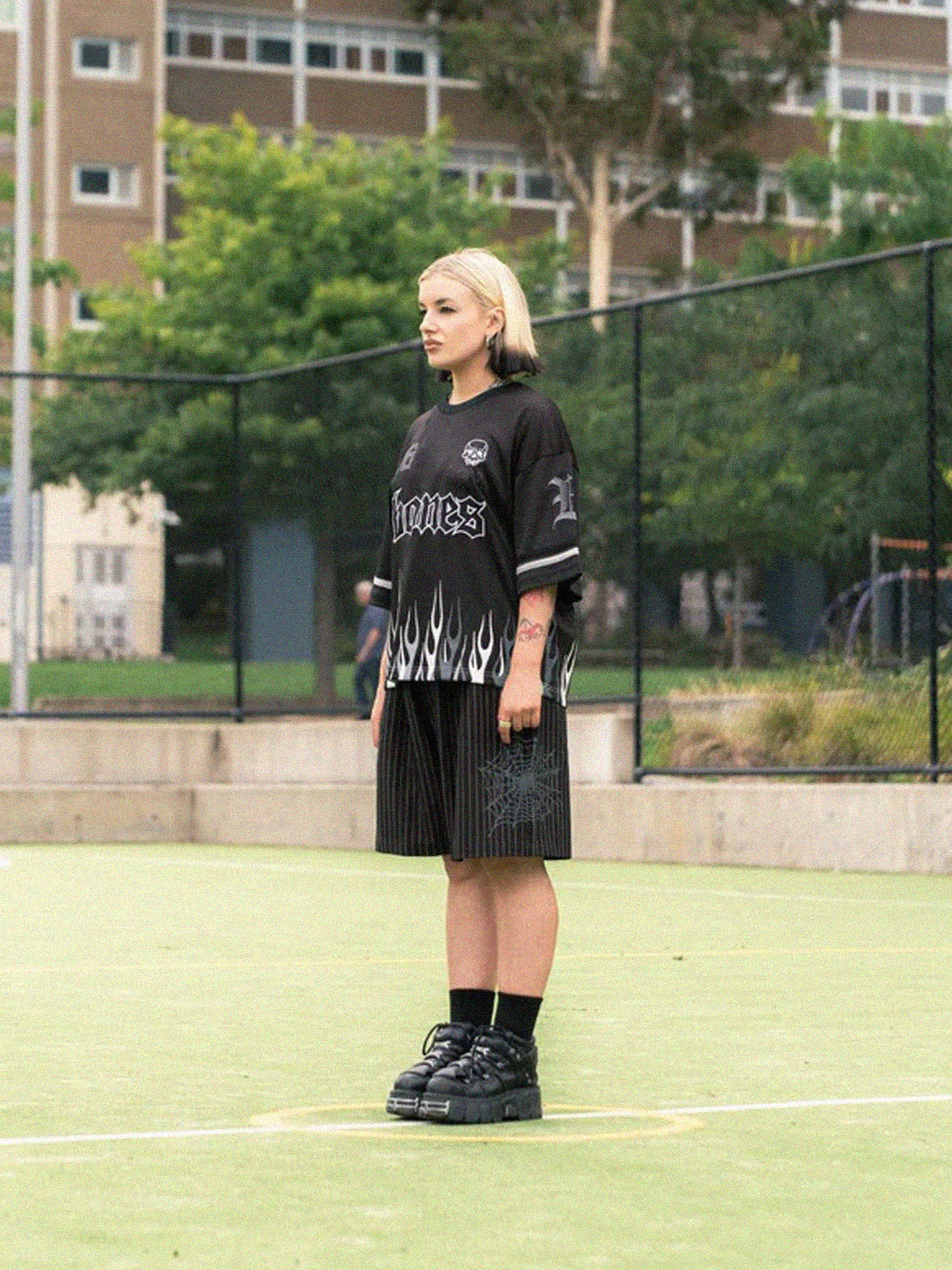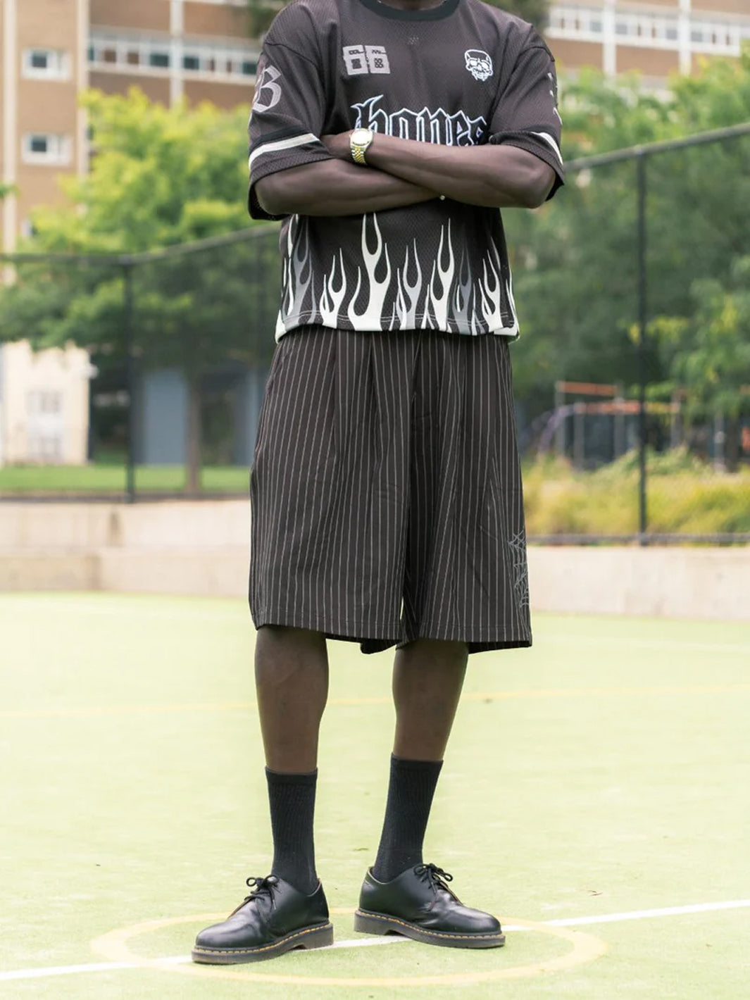 The Pinstriped Webbed Pleated Shorts, featuring a subtle spider web screen printed on the left side. Made out of a poly-mix for a lightweight, breezy feel. Perfect for Summer and looking the part for your next try out or job interview.