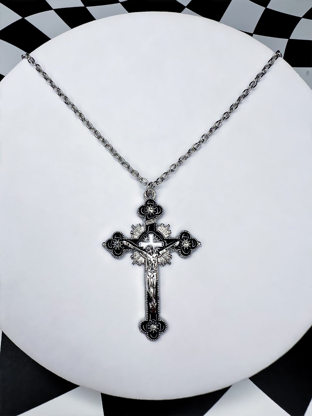 This piece is definitely a statement piece. We love this black cross pendant chain necklace. Perfect to wear as it or as it sits on a longer chain can be easily layered.
