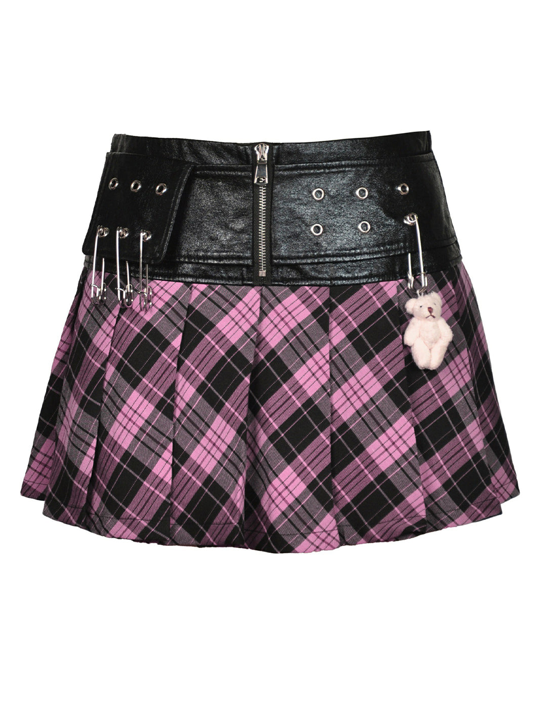 Cute with a bite, the Club Rat Mini Skirt brings punk charm to your fit with its pink plaid pleats and faux leather details. Safety pins, grommets, and a tiny plush bear charm finish the look with the perfect mix of sweet & edgy.