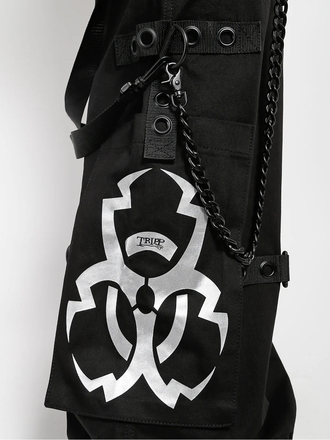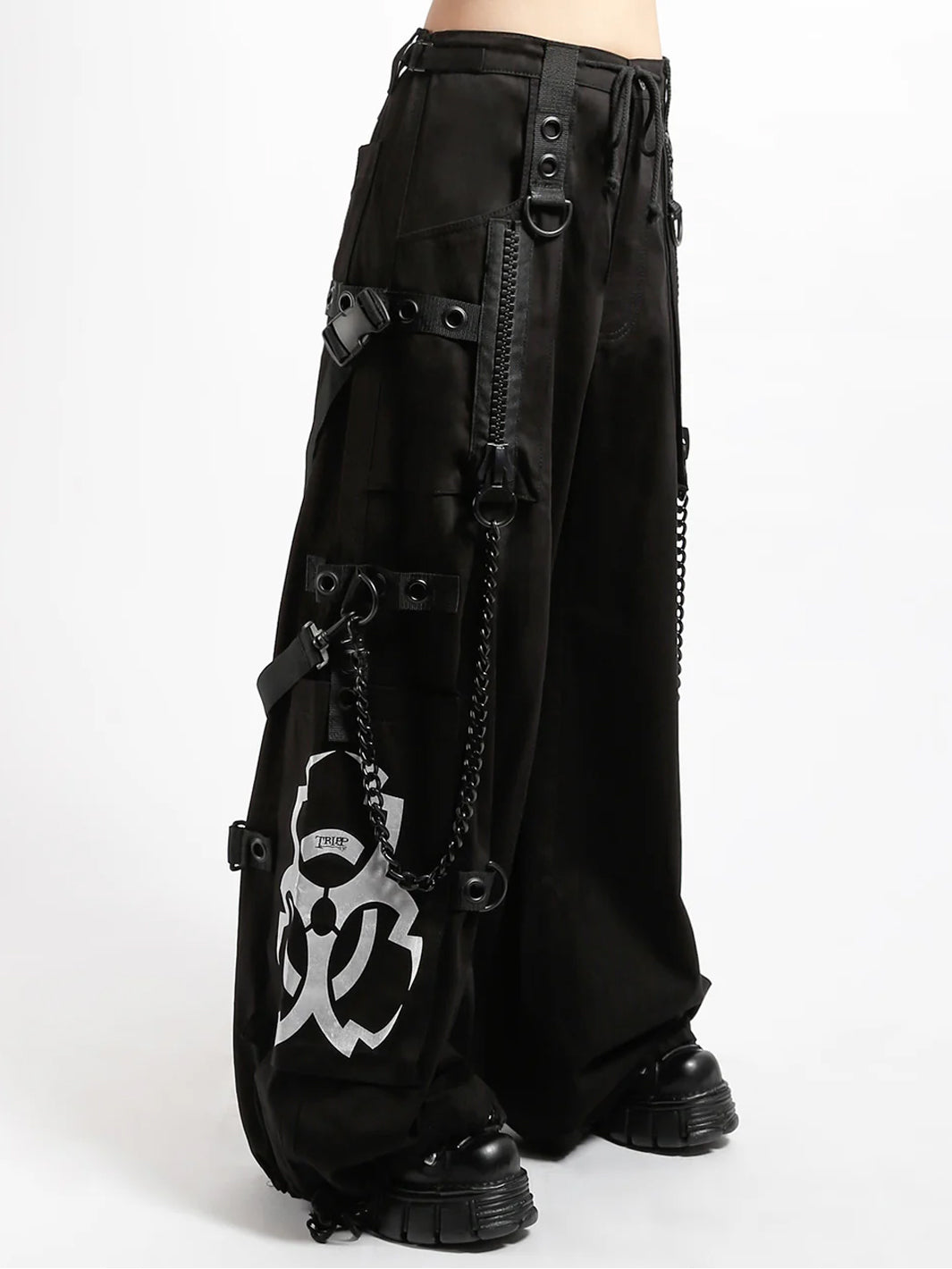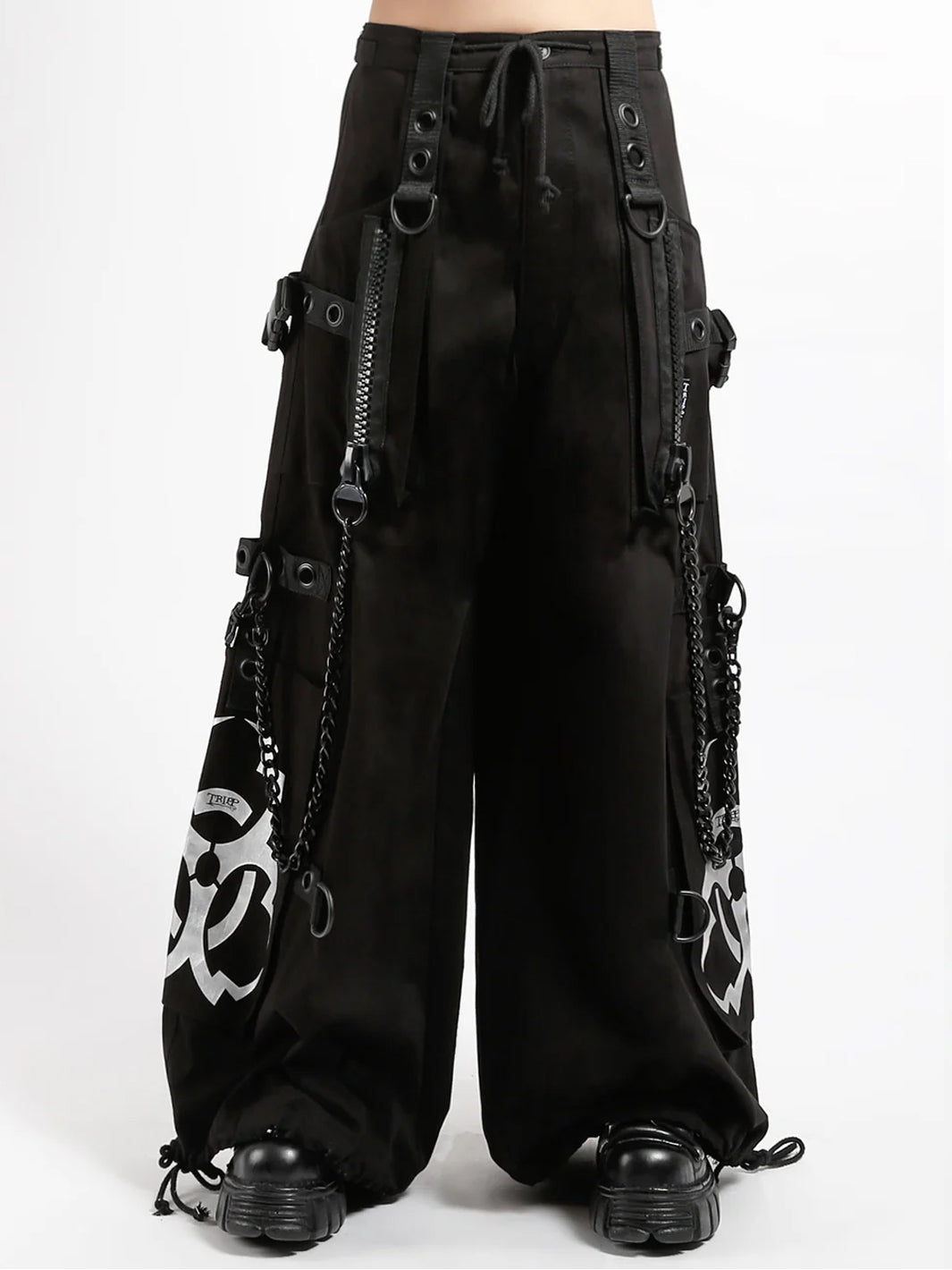 - Silver metallic Y2K biohazard symbol on each leg