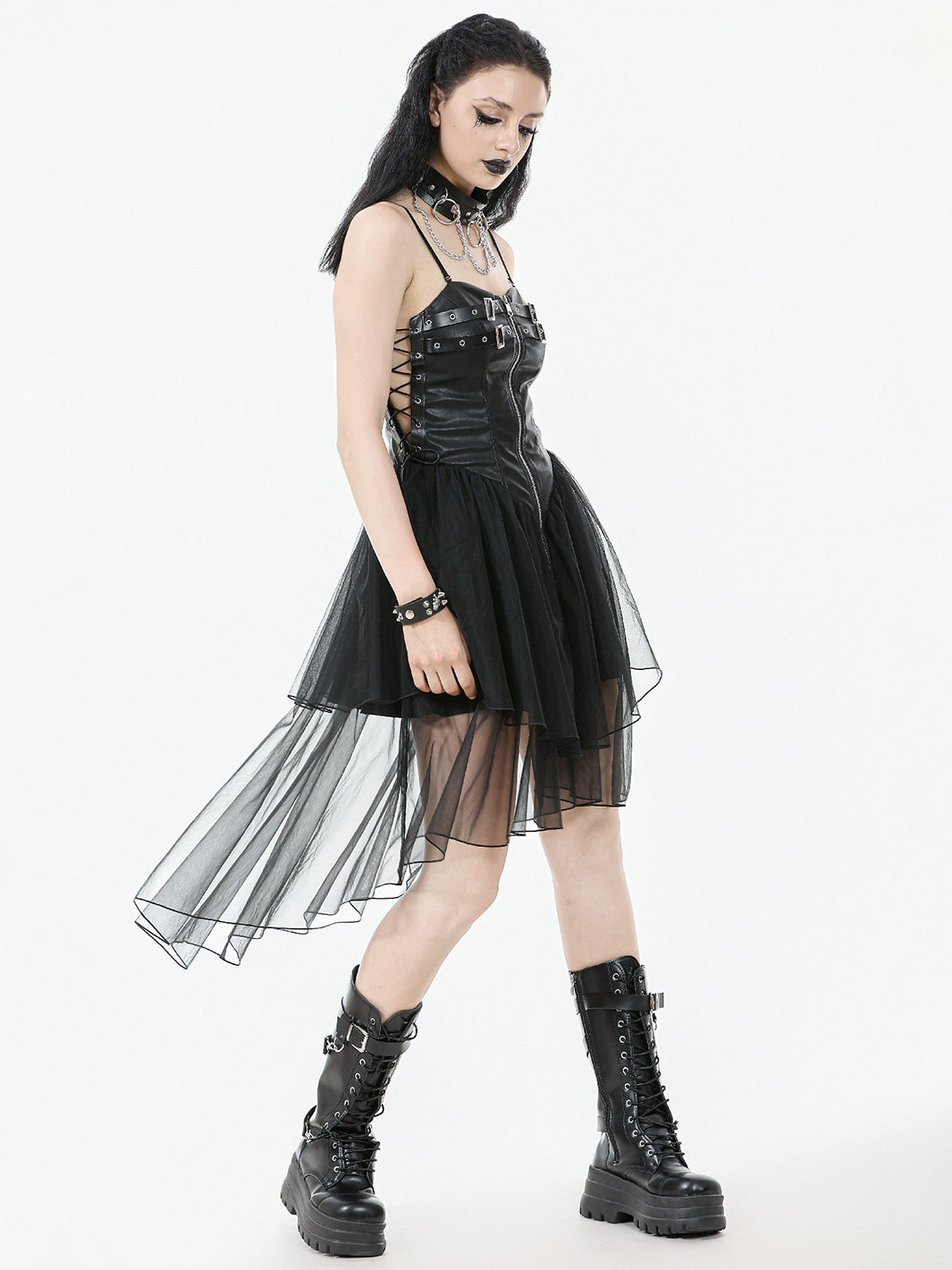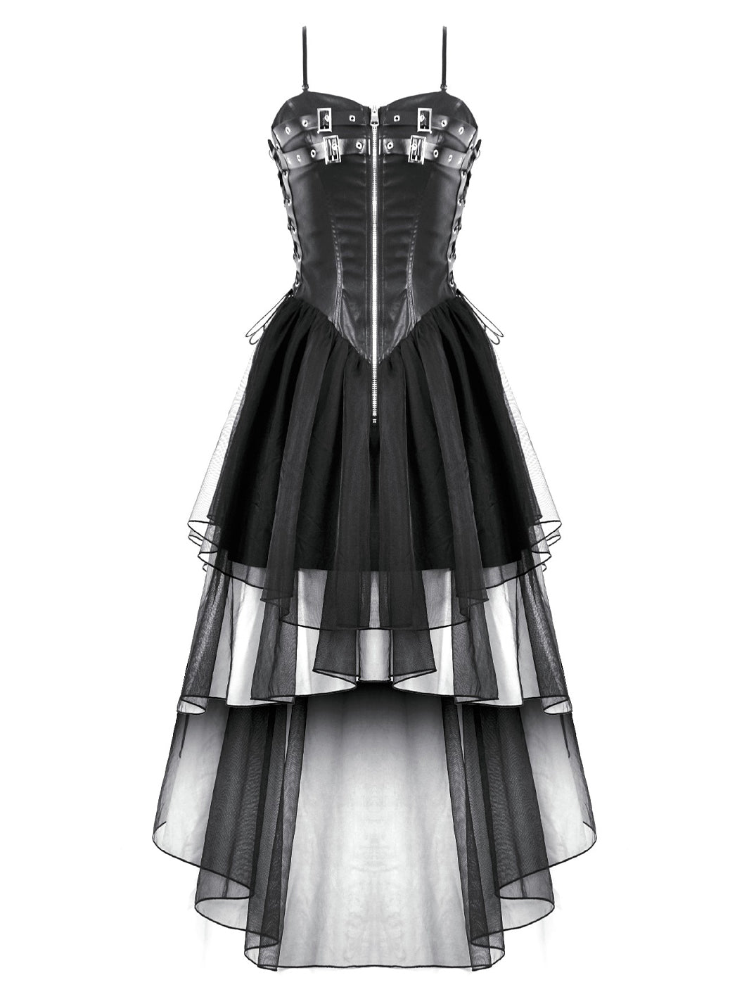 Own the room in this punk faux leather and mesh dress. The structured bodice, metal hardware, and flowing layered skirt create a bold silhouette that shifts from fierce to ethereal with every step.