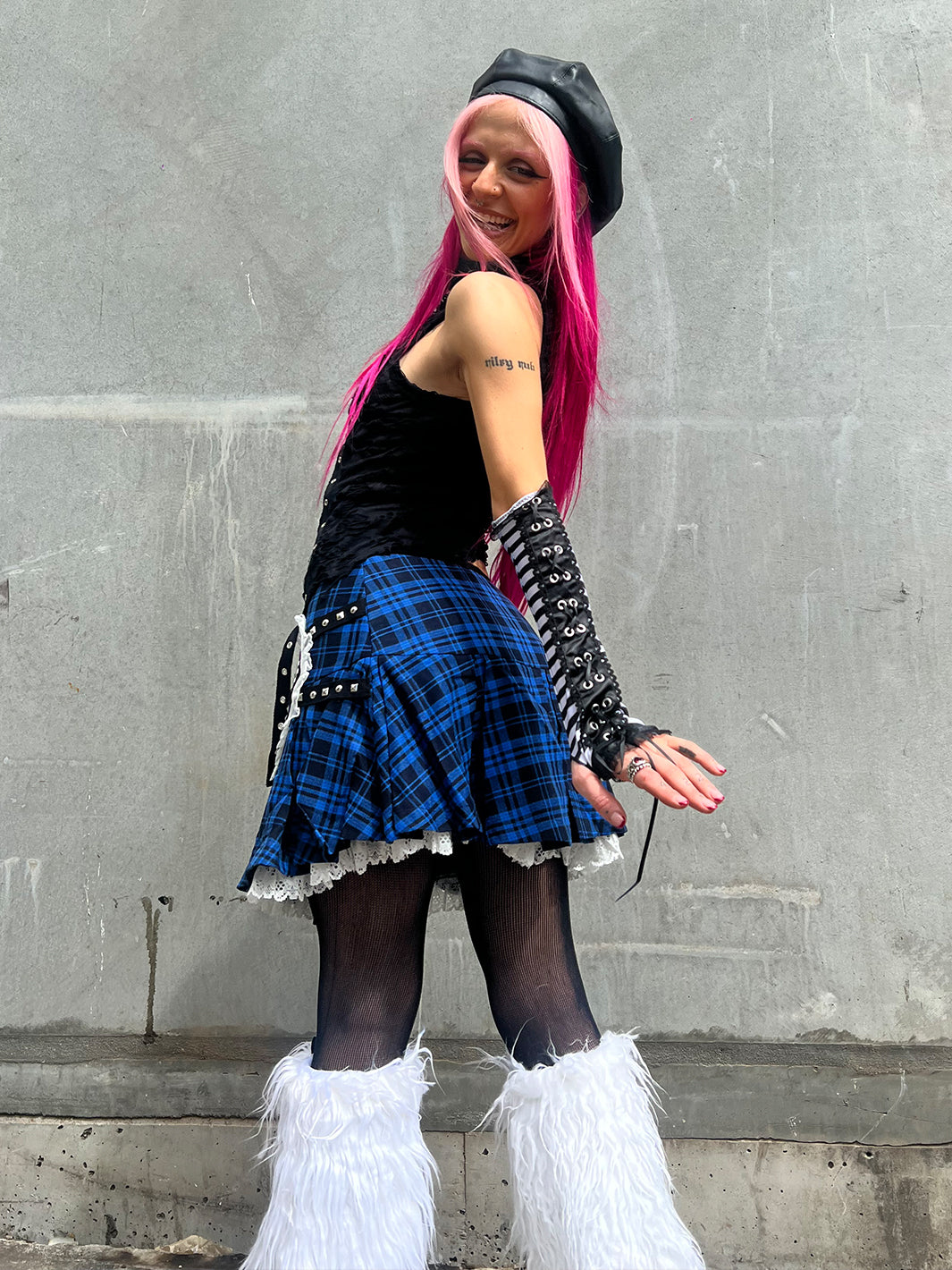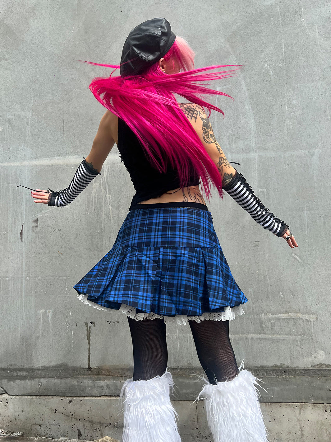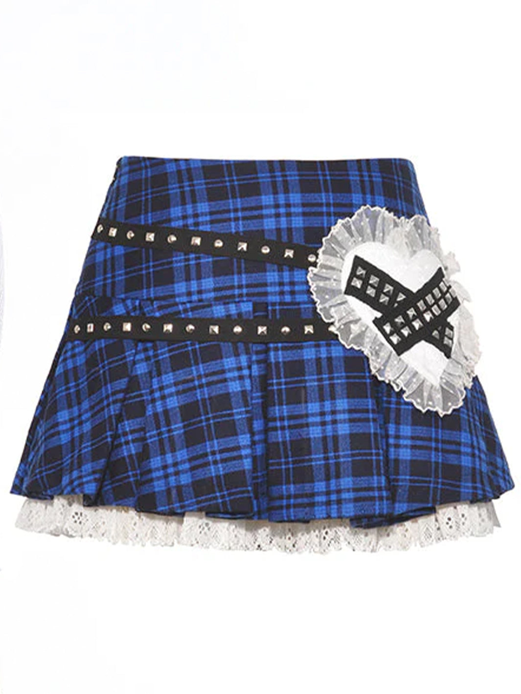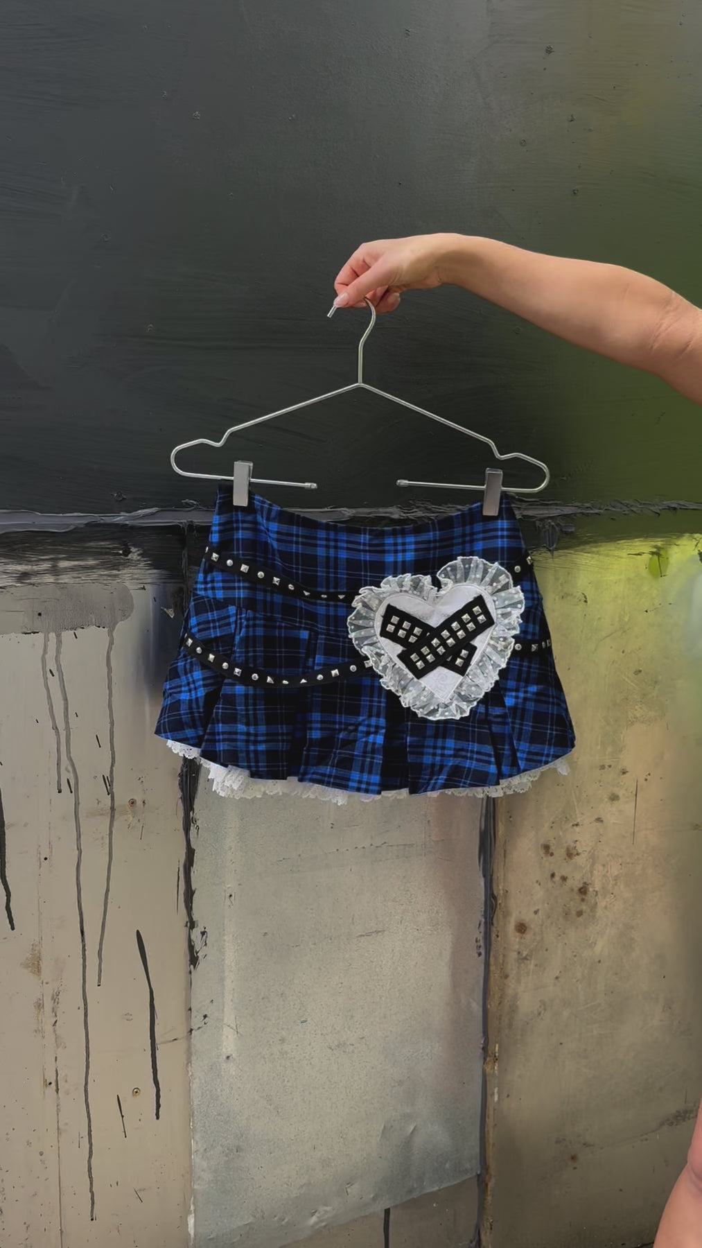 Some wear their heart on their sleeve, but you wear yours on your skirt! This blue tartan mini is a classic with a twist featuring a heart detailing, studs and the cutest lace fringe for a layered look.