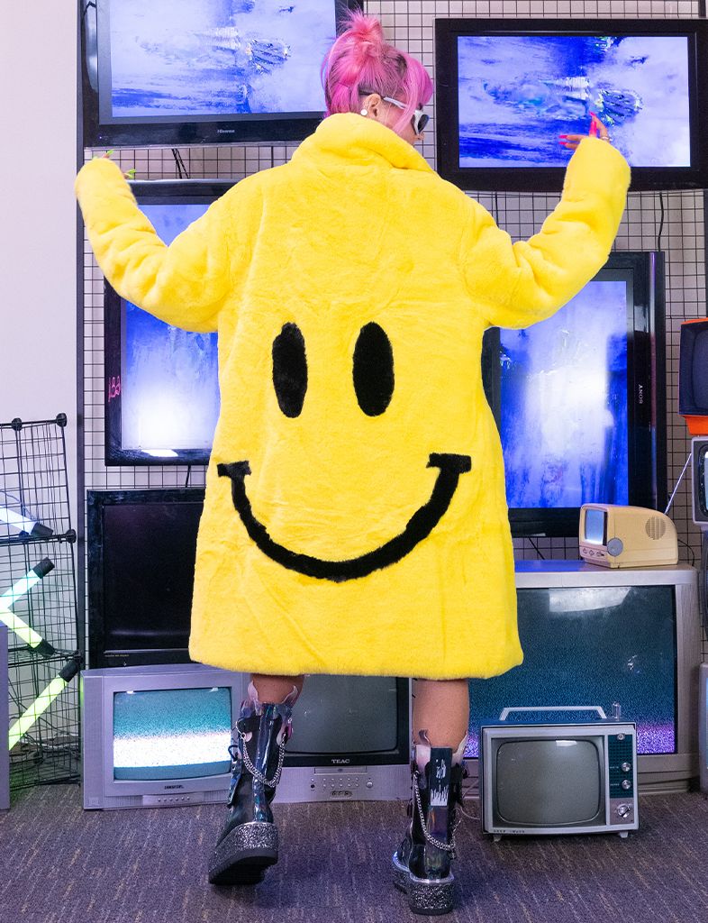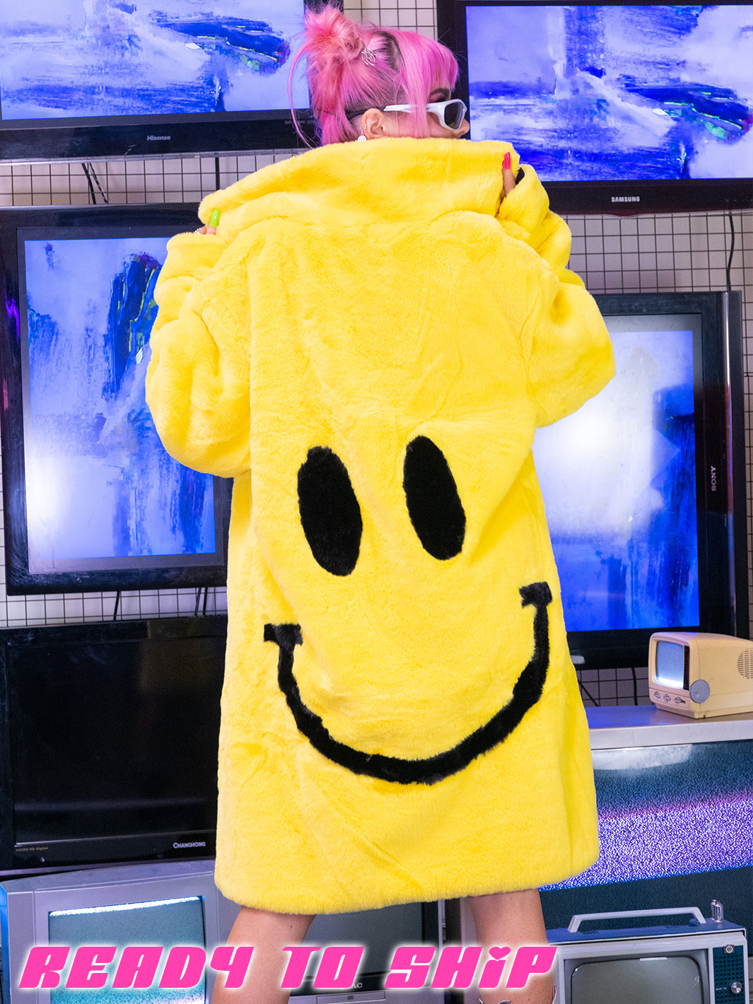 You're never fully dressed without a smile! Slip your bright yellow smiley faux fur jacket on to complete your look and be cosy as all hell.