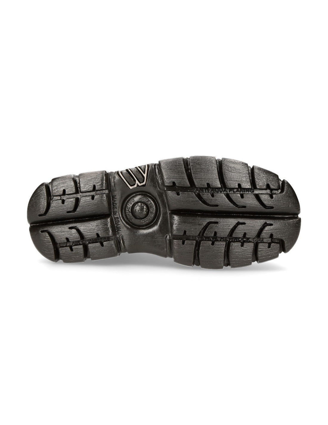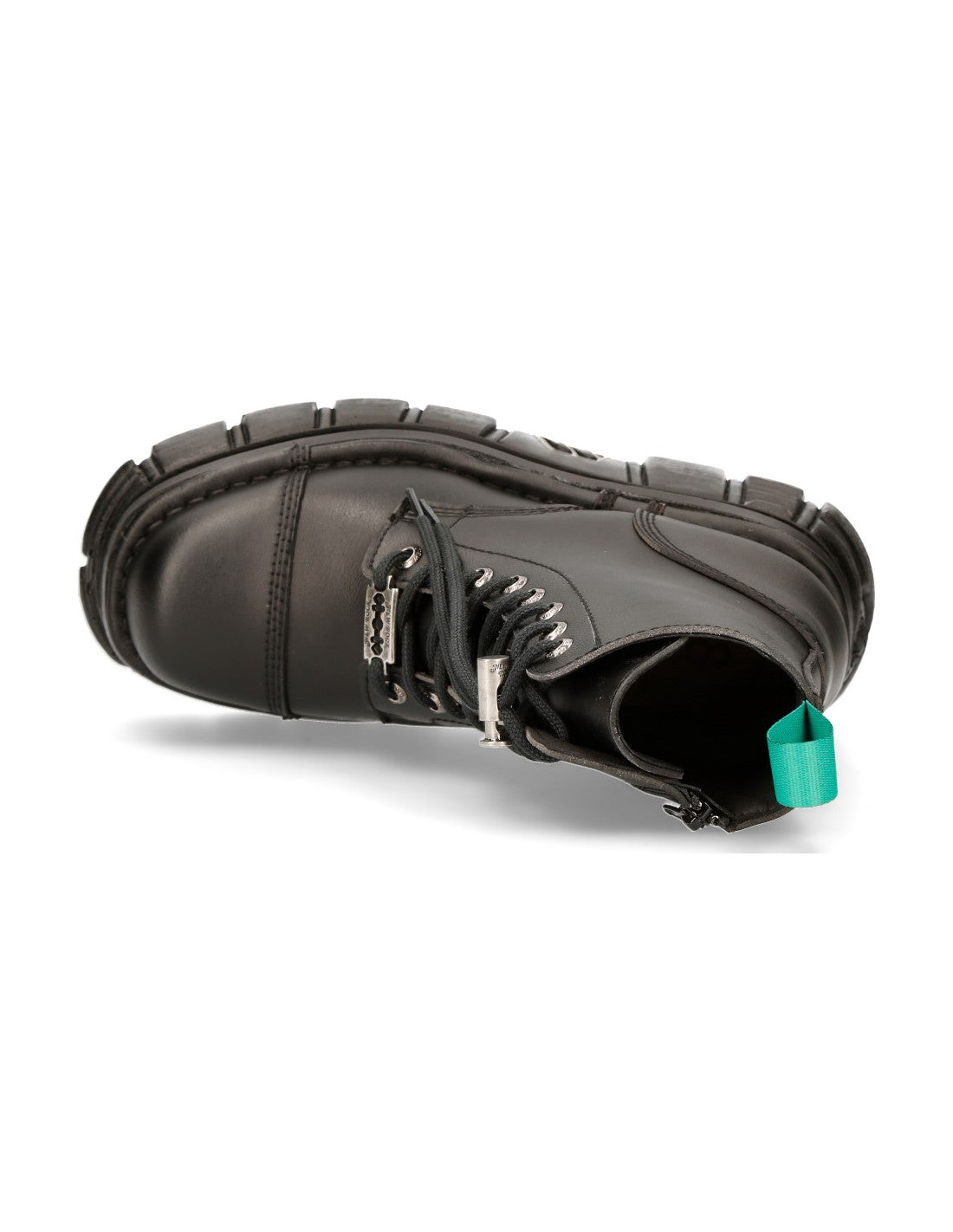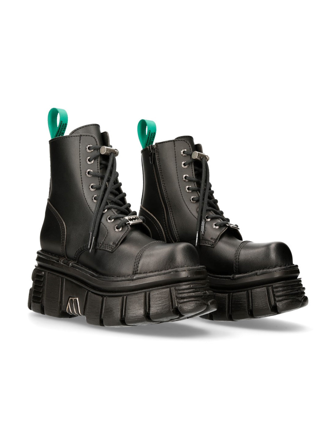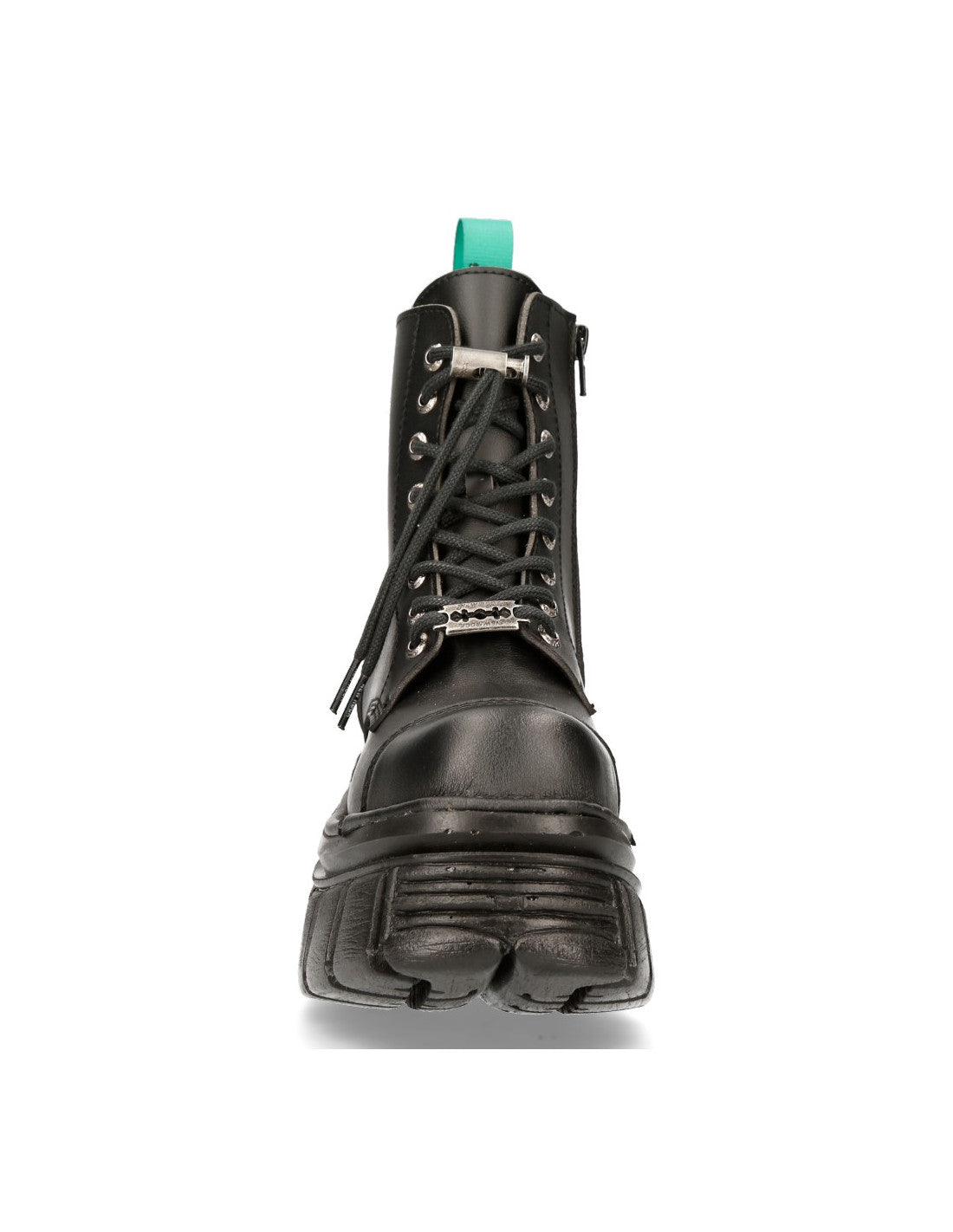 New Rock - The ultimate goth footwear brand from Spain! From the Metallic collection comes the M-NEWMILI083-VS2, a military-inspired ankle boot made from vegan materials. Clean black finishes, sharp lacing, and a solid platform give this style a strong, structured look, paired with New Rock’s signature build and attention to detail. A modern take on a classic heavy silhouette, reworked in a fully vegan version.