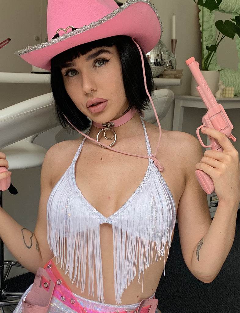 Such a fun top - in shimmering hologram white, this fringe trimmed crop is the cutest! Match it with the Hot Shorts for a v cute iridescent fit - or take it one step further with the fringe trimmed chaps - LOVE!
