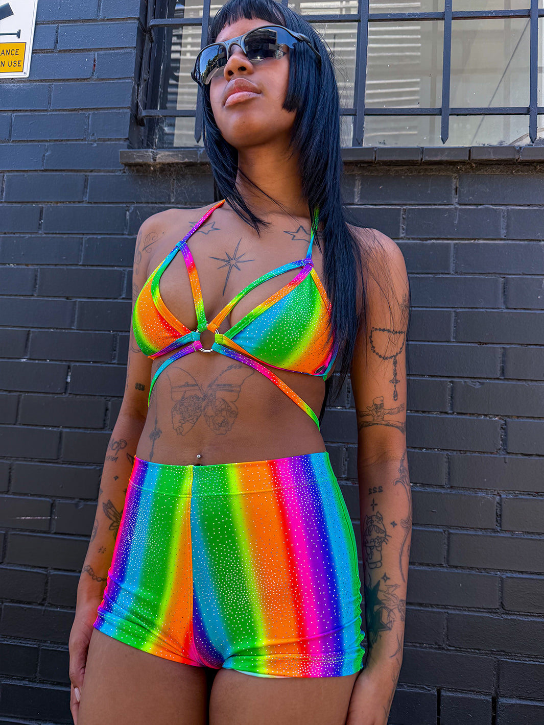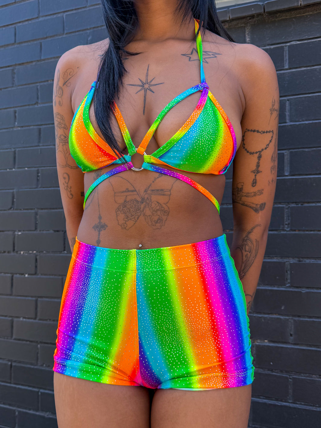 These Roller booty shorts will slip on every peach! In a vibrant sparkling rainbow lycra, they are the most comfy & flattering fit, perfect for dancing the day away!