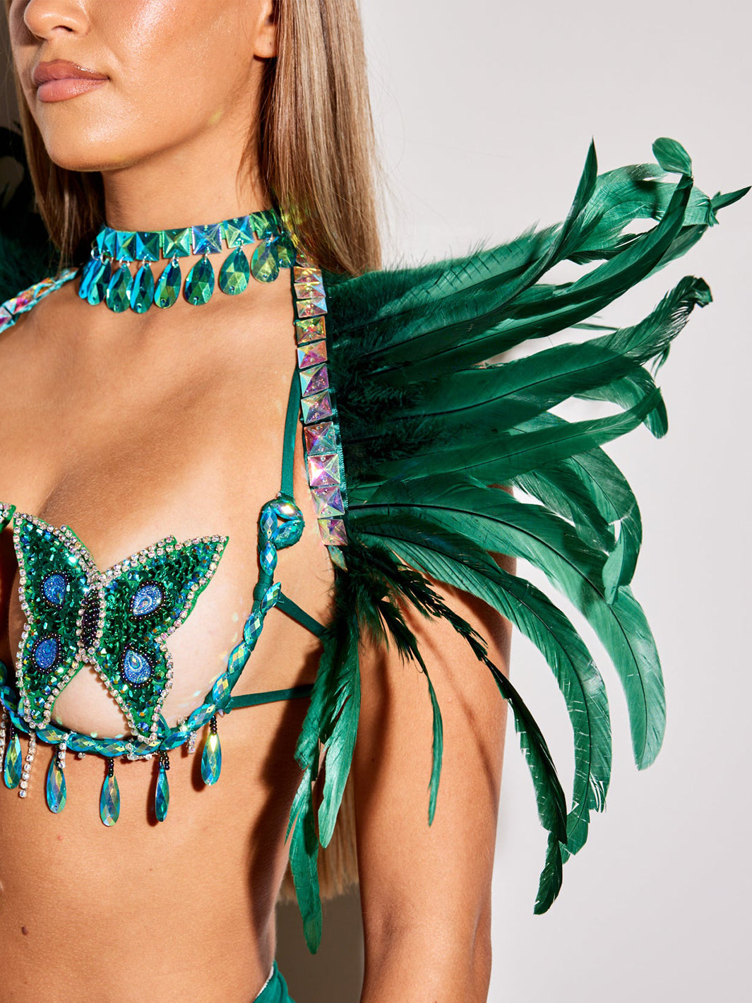 Bring the SHOWGIRL energy to life with this gorgy green feather shawl – the ultimate finishing touch for your carnival fit. Designed to wrap around your back and arms, this beauty ties up perfectly to frame your carnival bra and sparkle on the dancefloor.