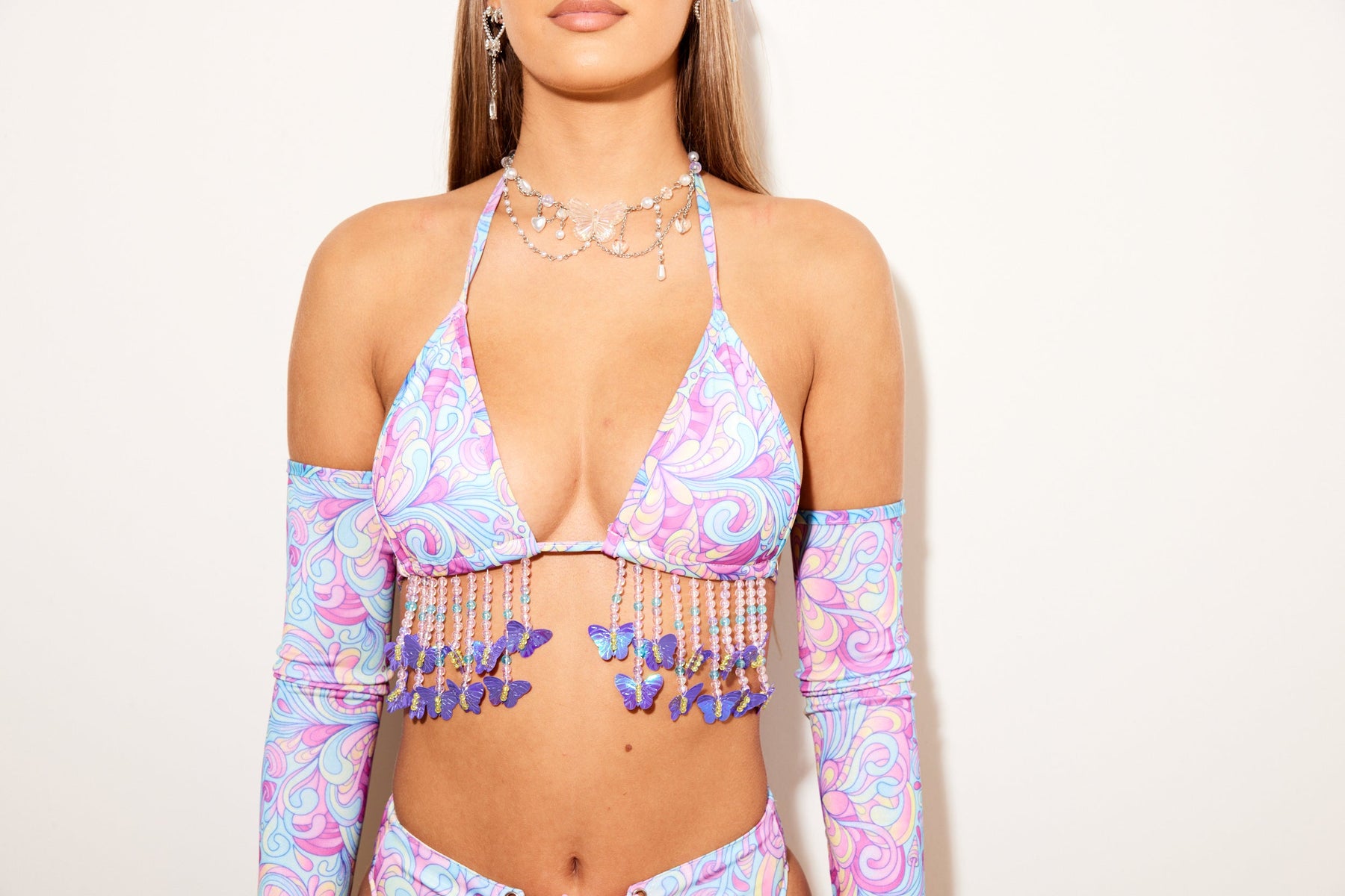 Step into a dream with the Magic Mushroom Bikini Bra – a trippy, sparkly piece that blends psychedelic fabric with fluttering butterfly details. Perfect for dancing fairies and festival muses alike.