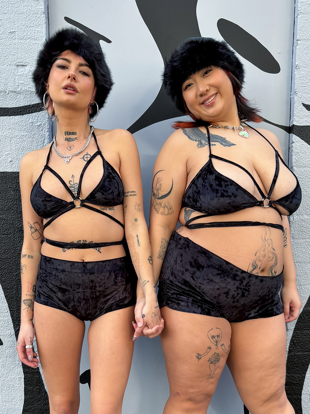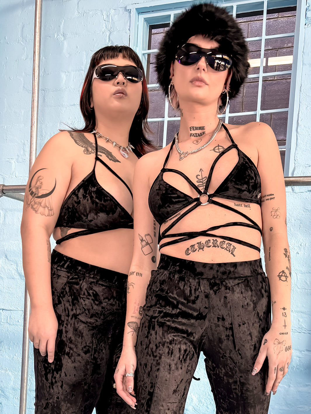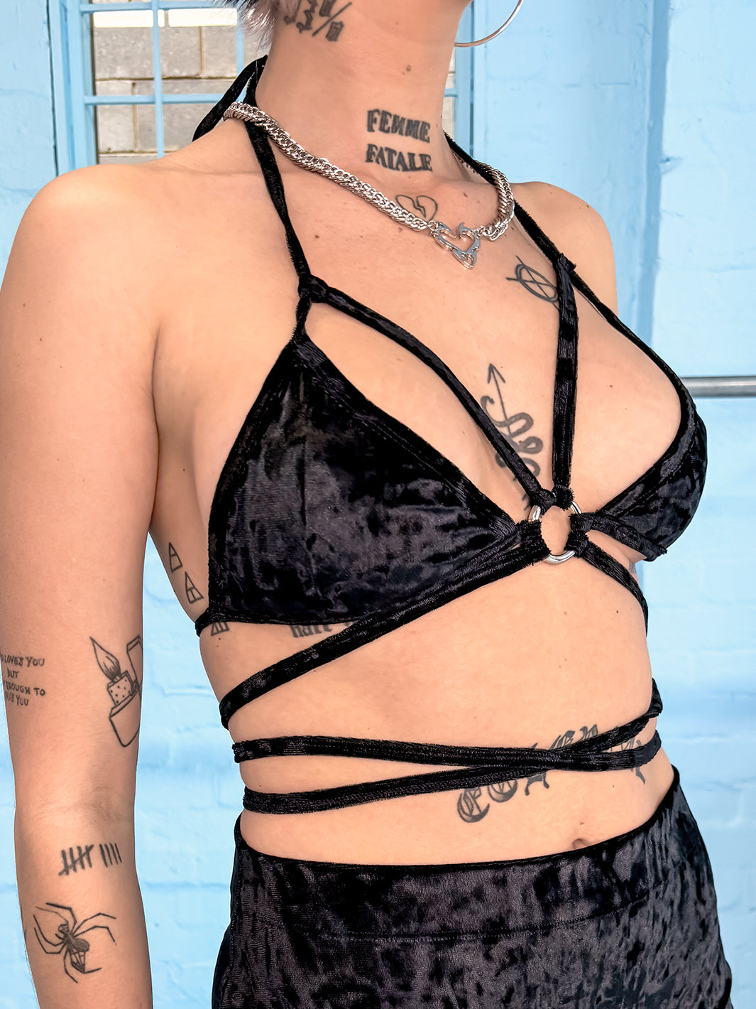 A gorgeous little triangle top with an eyelet front - gorgeous wrapping details and looks super cute when paired with the matching shorts or flares!