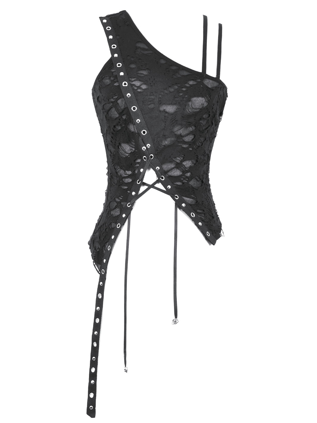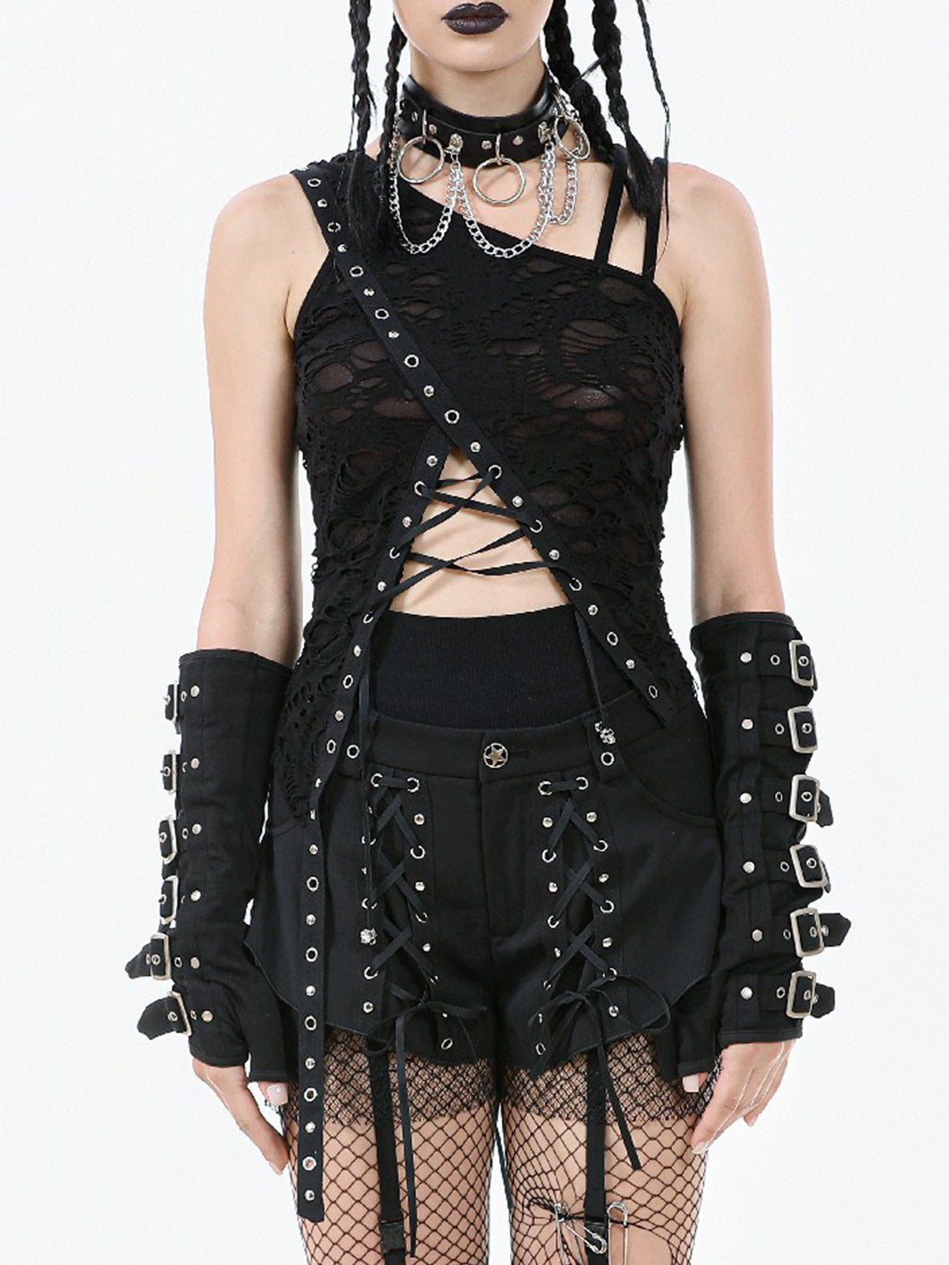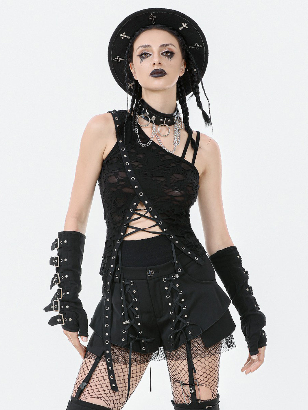 Dark, deconstructed, and built for the end of the world. This asymmetric punk top brings shredded mesh, heavy grommet straps, and a lace-up cutout waist for a look that’s pure post-apocalyptic goth.