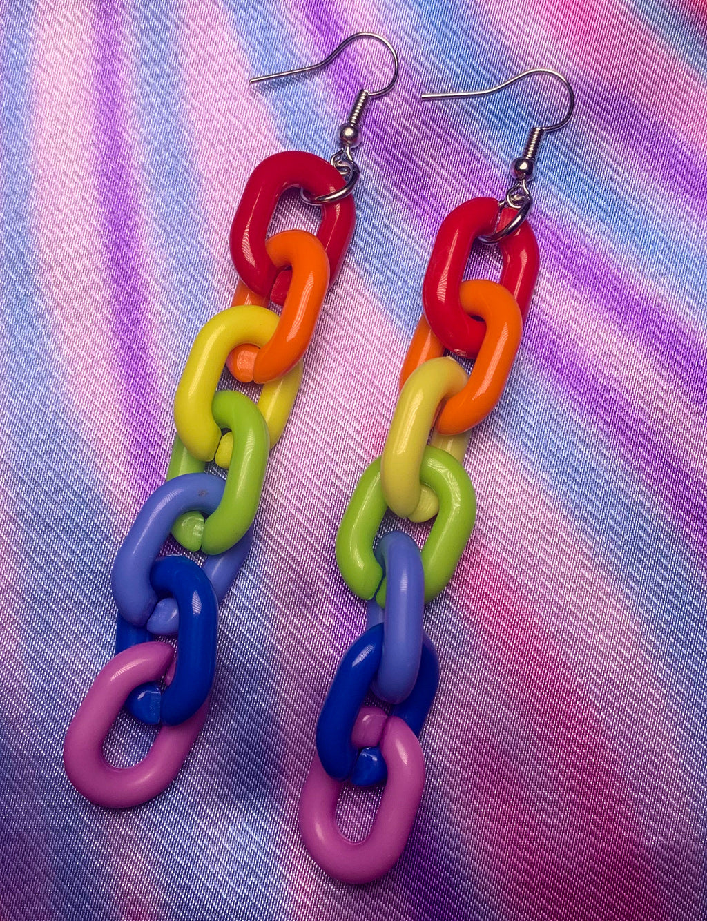 How cute and rainbow are these earrings! Rainbow chain details sitting on a comfy hook!