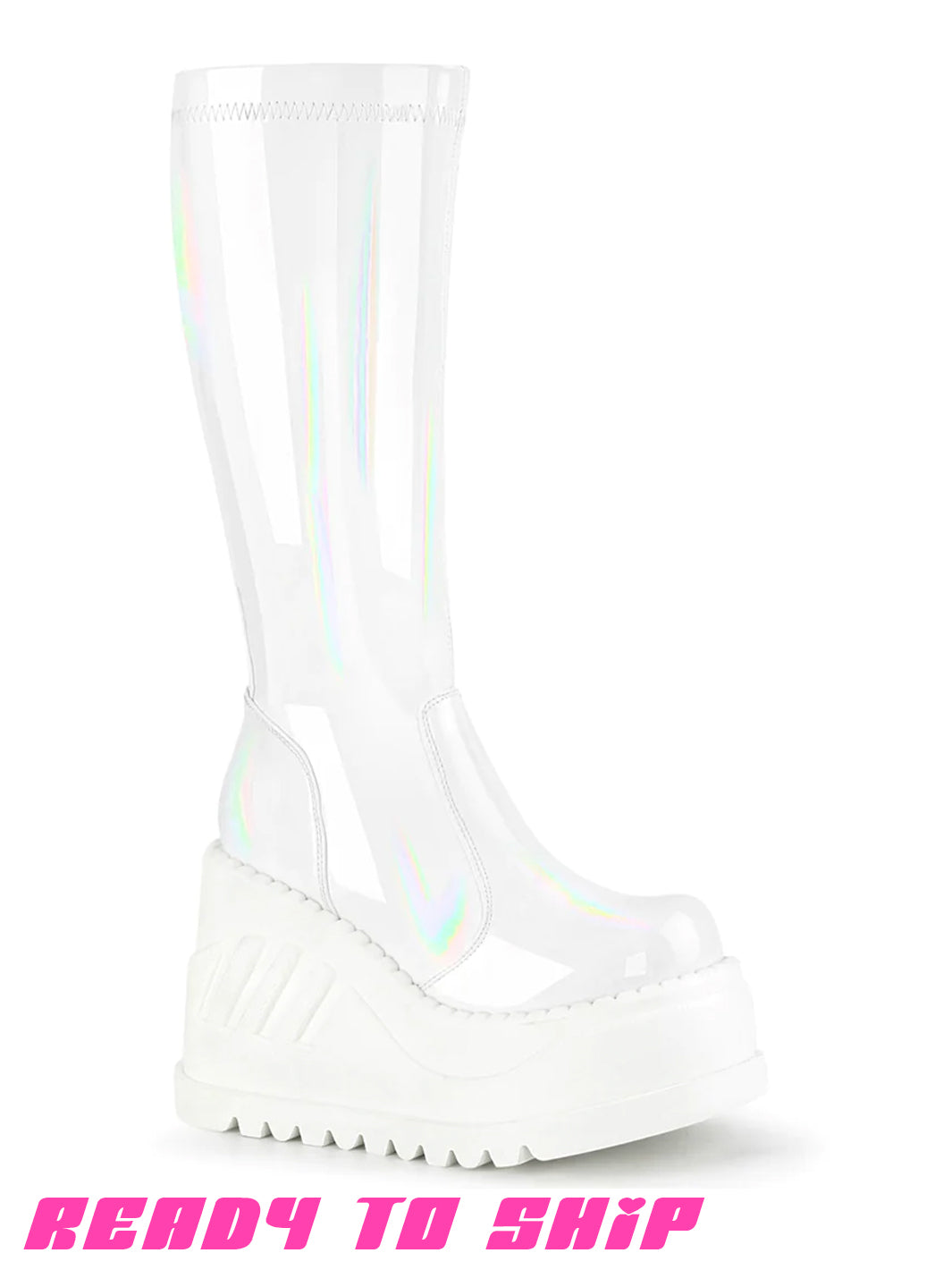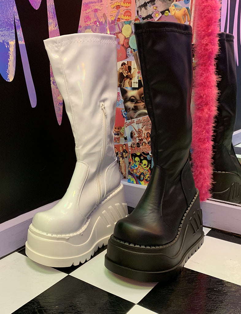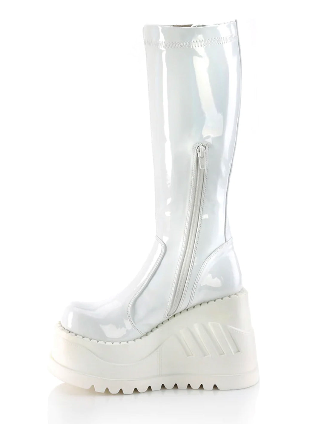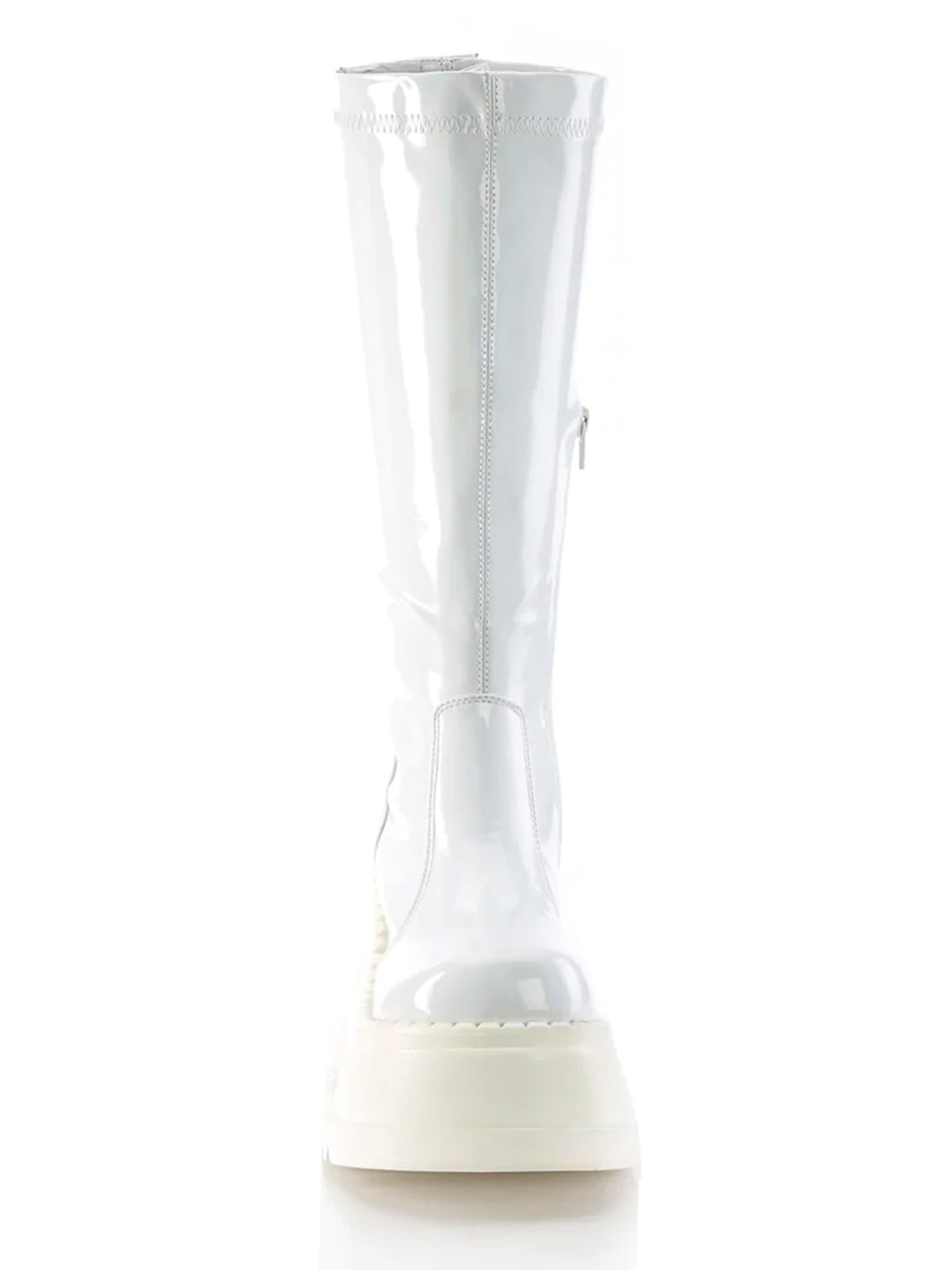 Get ready to slip these all white patent boots on and add them to the wardrobe cause these knee high boots that are sooo comfy you'll never want to take them off.  A super comfy wedge platform making them perfect to stomp from day to night.