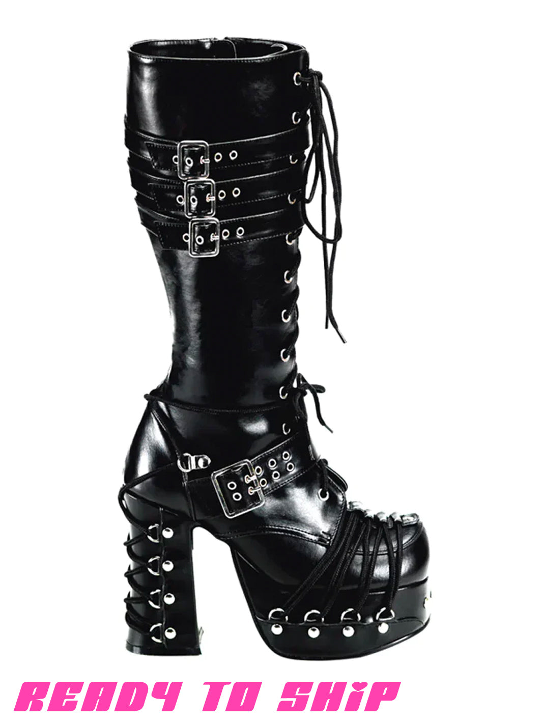 Dark, dreamy, and built to make an entrance. These lace-up knee boots bring full goth punk Lolita energy with corset styling, buckles, studs and stacked straps across the platform.