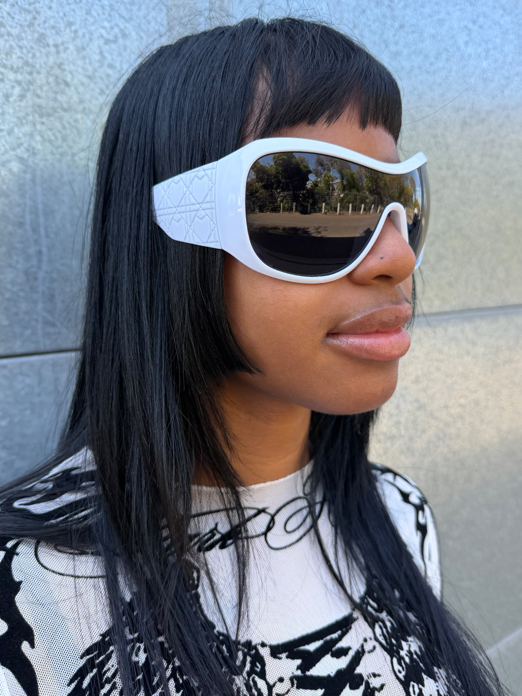 Meet your new glam go to. These shades bring that effortless beach club energy with their oversized wraparound shape and white frames.