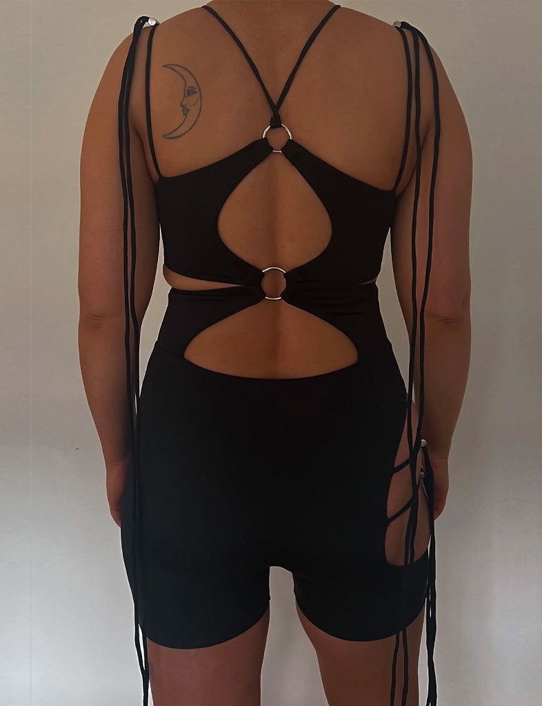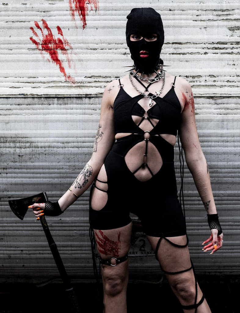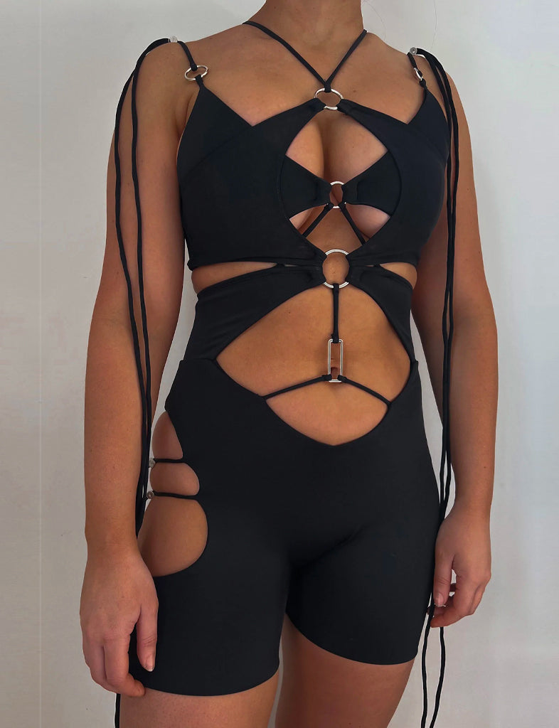 OK - another iconic bodysuit to see you through doof season - the Razor Bodysuit - with silver metal hardware, thick nylon with a bike short bottoms - you are not going to want to take this beauty off!