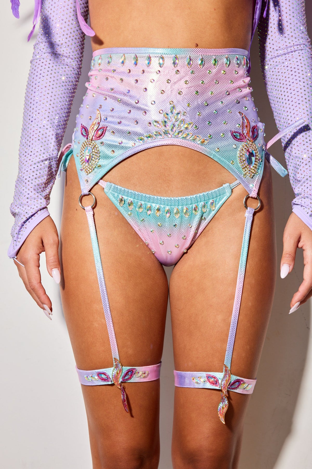 Channel the vibrant energy of burlesque dancers with our two-piece Fae Bikini Bottoms and Leg Wrap Garter, let your inner showgirl shine with the striking holographic hues.