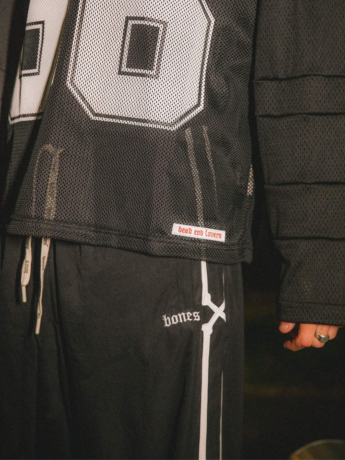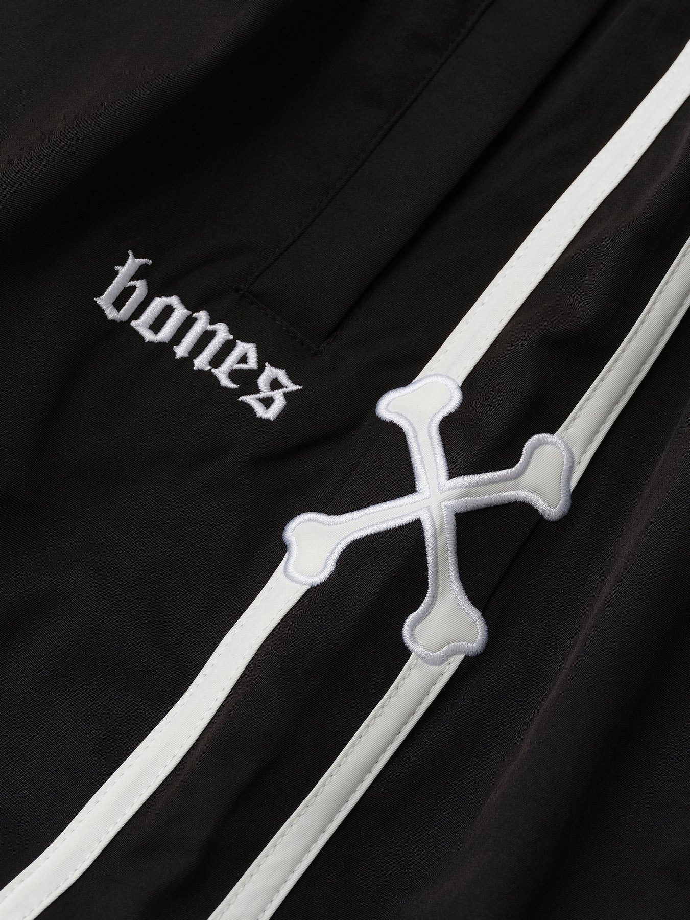 Comfort in the dark. The Doubled Crossed Track Pants feature white vertical piping with a bold X-intersection detail on the leg, plus a small embroidered “bones” logo for that subtle edge. Comfy enough to chill in, clean enough to wear out.