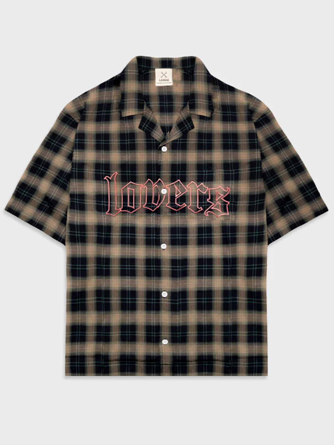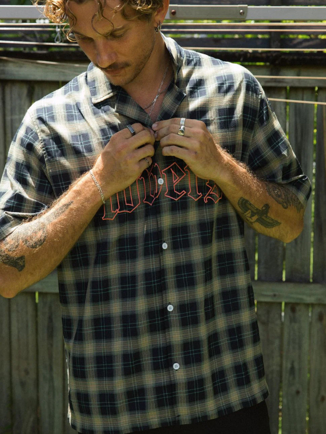 Meet the Lovers Check Bowlo, made for late nights and early mornings with your lover, featuring our custom made olive plaid pattern and large pink lovers embroidery.