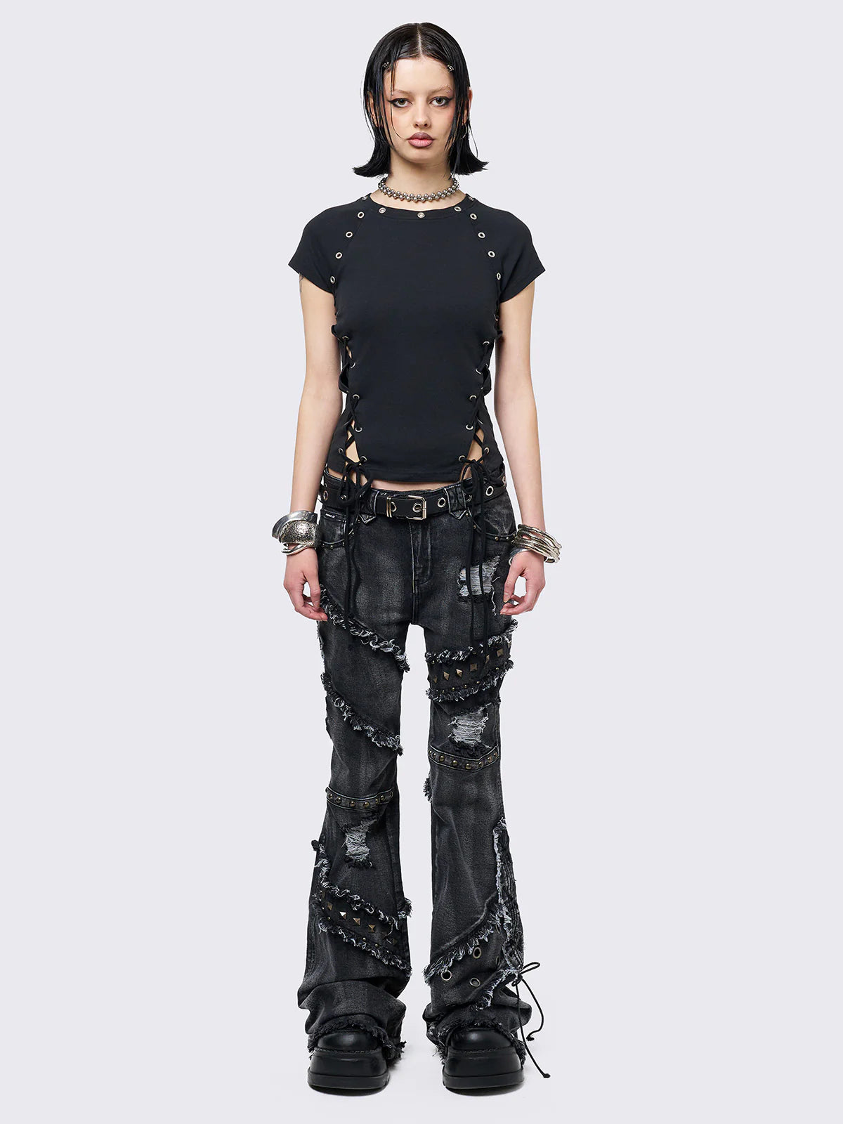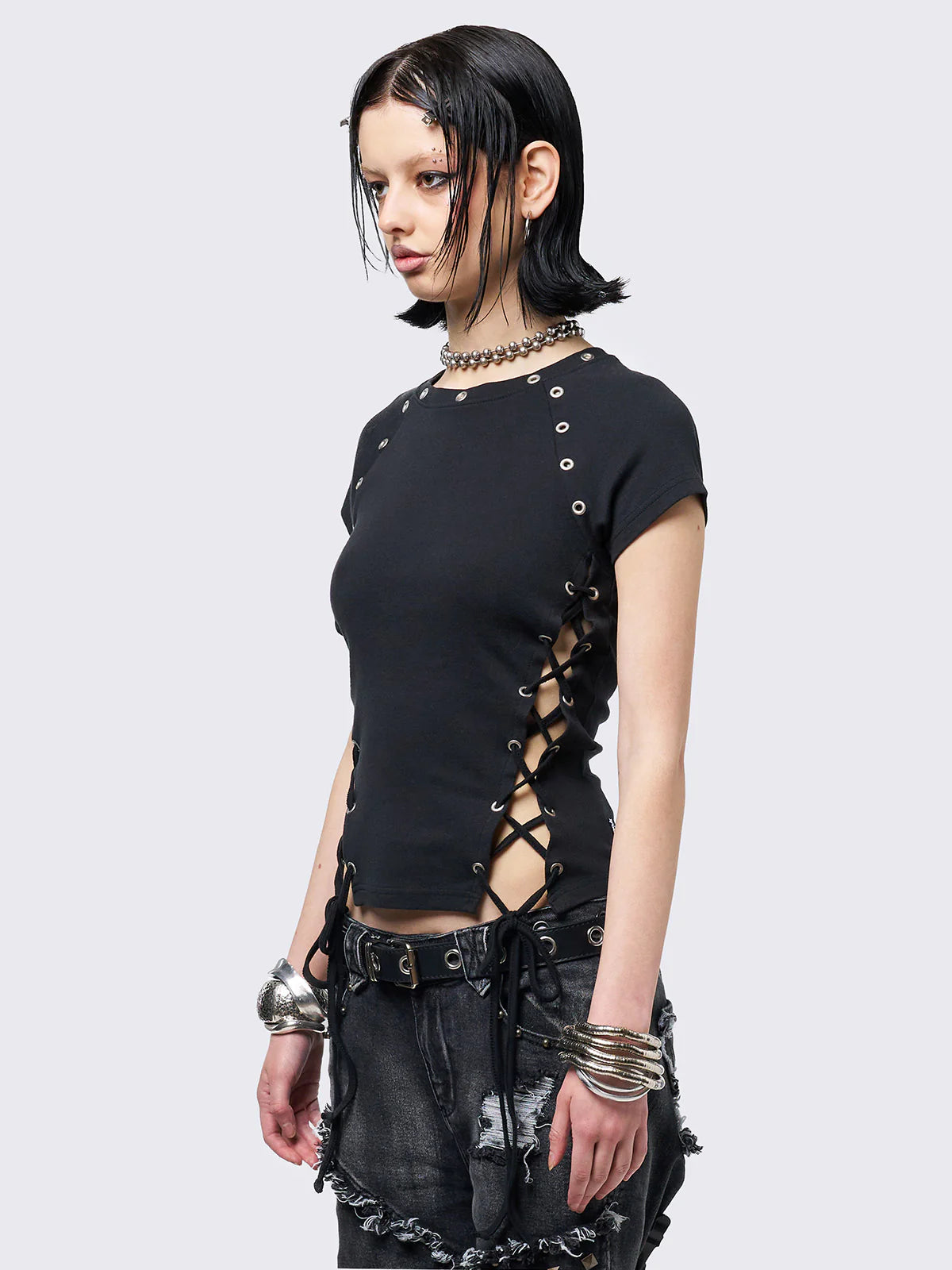 You’re about to fall hard for this top. Lace-up sides, eyelets, and attitude—this baby tee’s got it all.